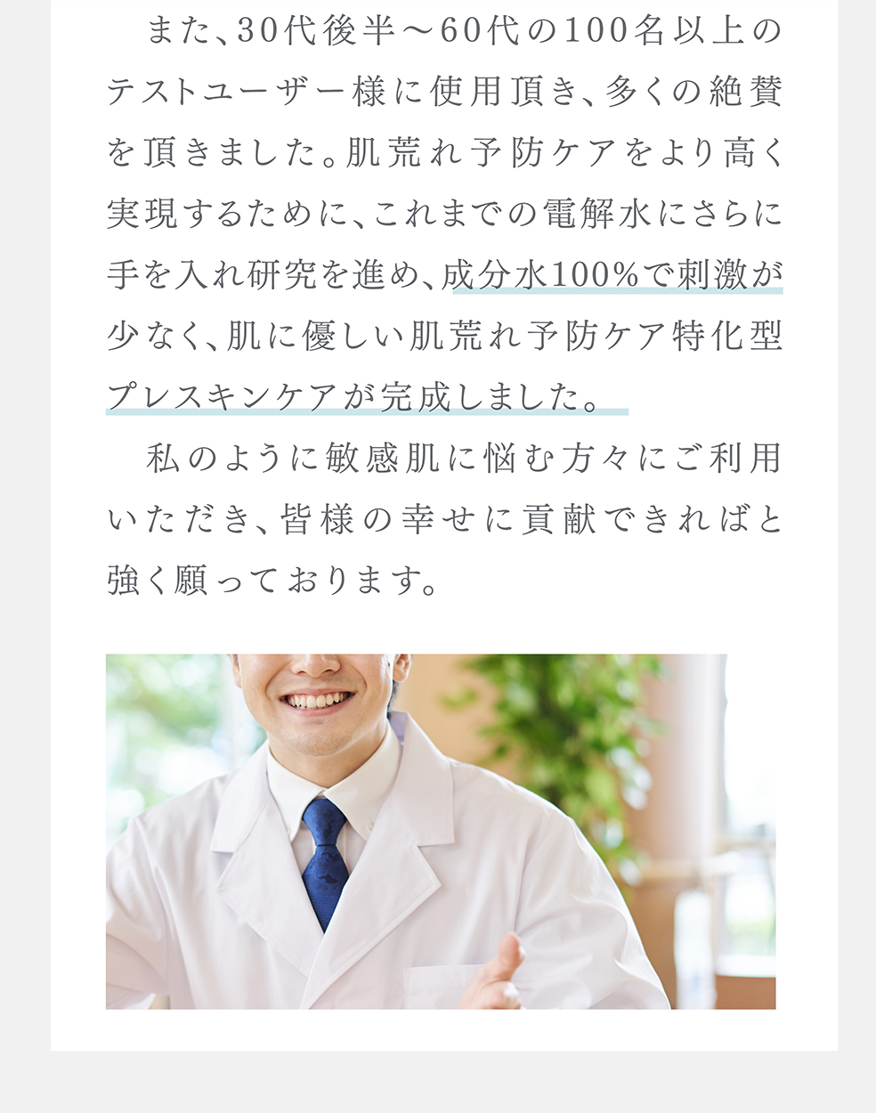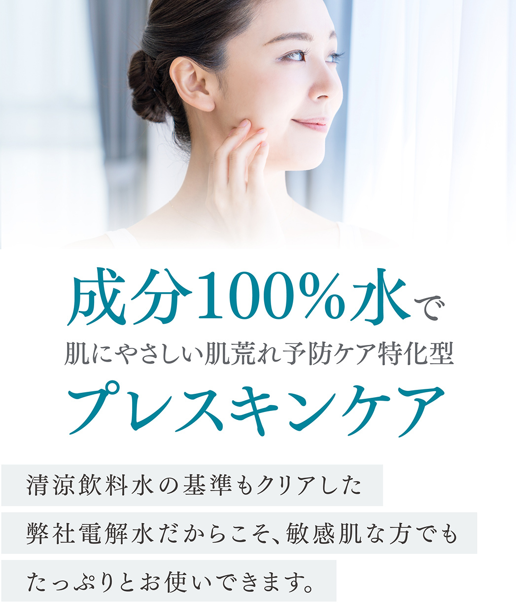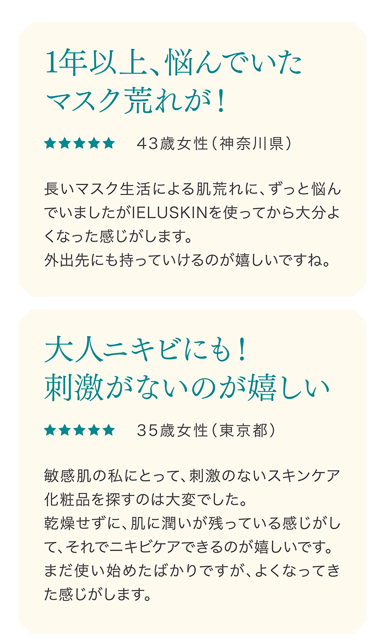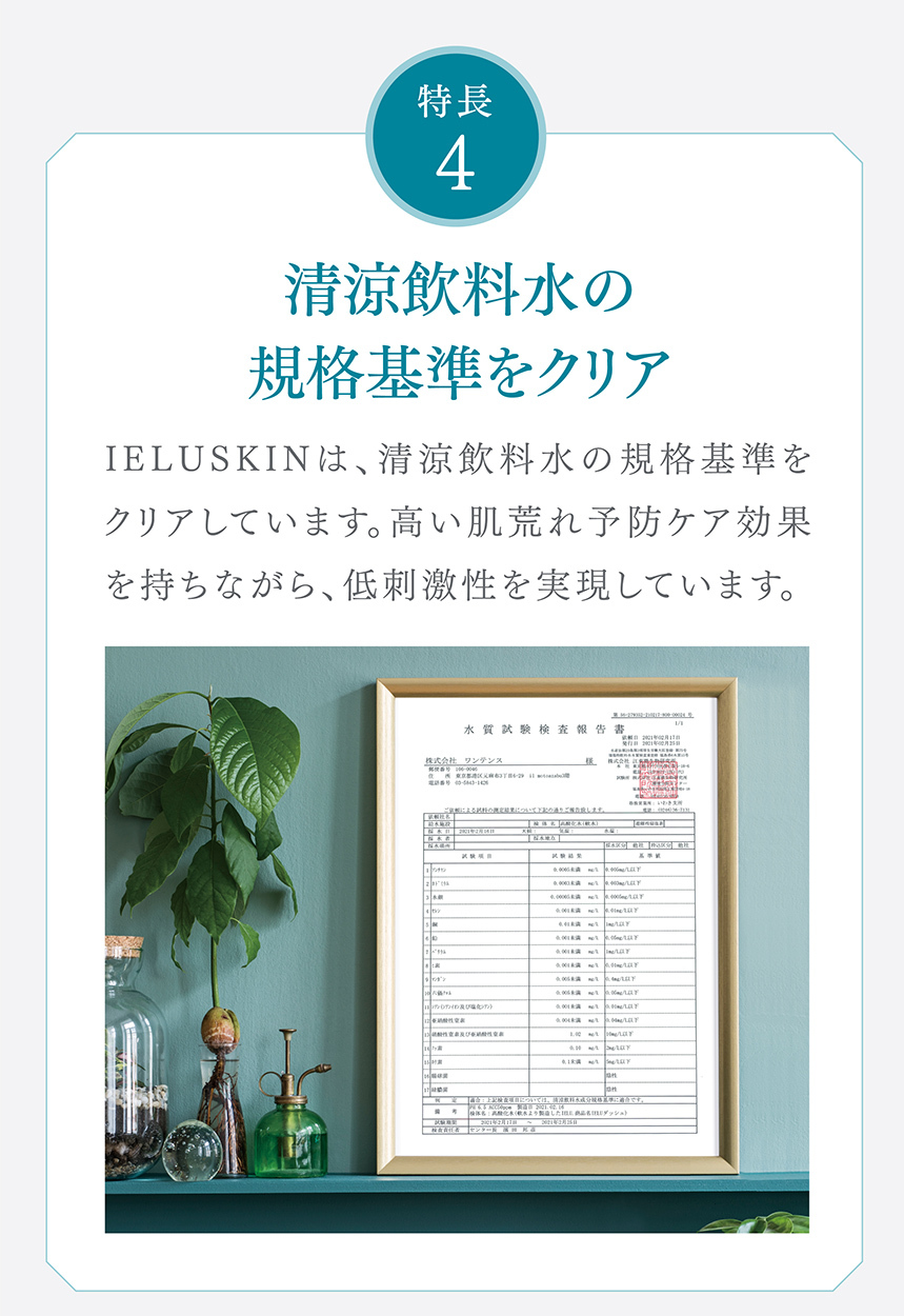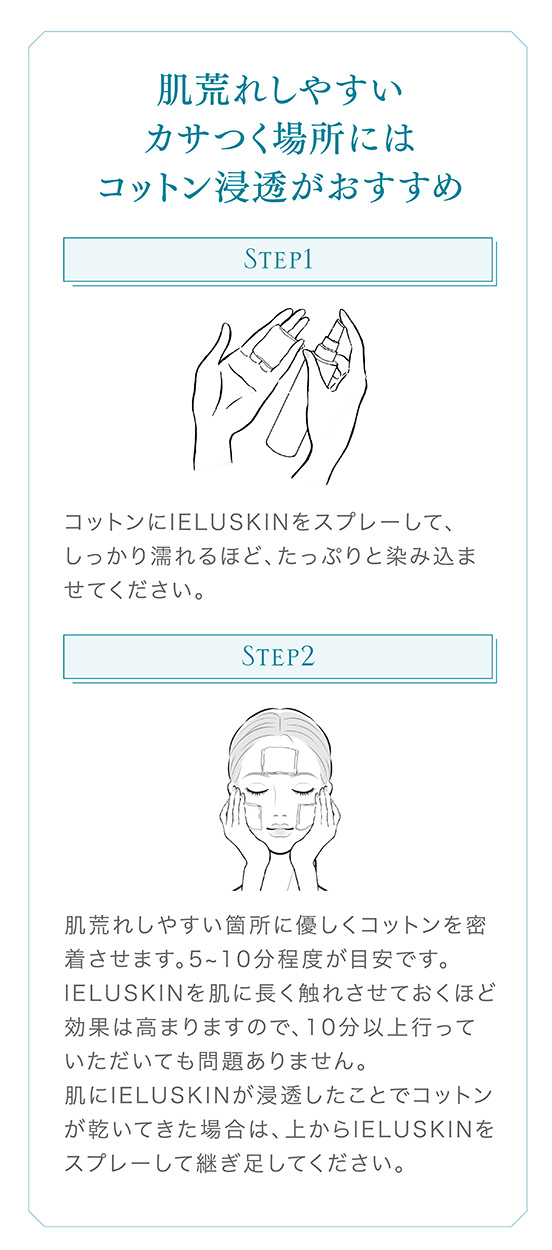 当社独自の電気分解製法により、①肌荒れ予防・乾燥ケア効果の高いイオン種をたっぷり配合し、②水分子を超極小サイズに制御し高い角質浸透力を、実現した電解水100%の、肌荒れ特化型化粧水です。マスク荒れなど、肌荒れ部分にたっぷりと塗布してください。接着時間が長いほど効果があり、1週間使い続けて頂ければ、実感できるという声を多く頂戴しています。