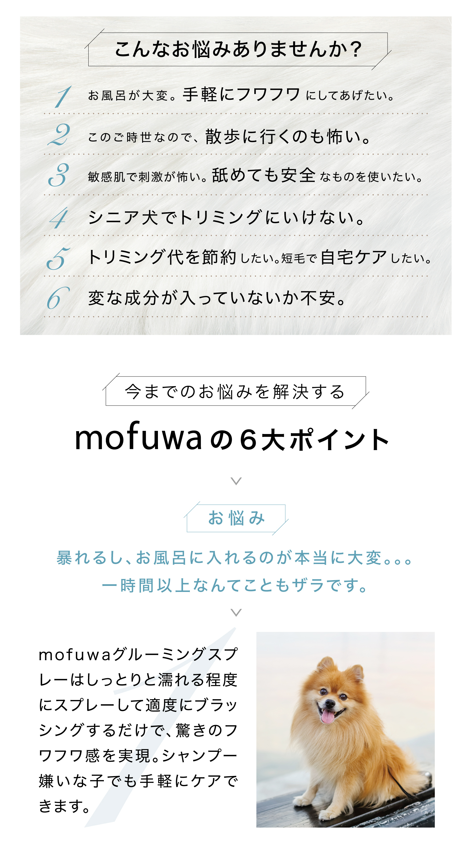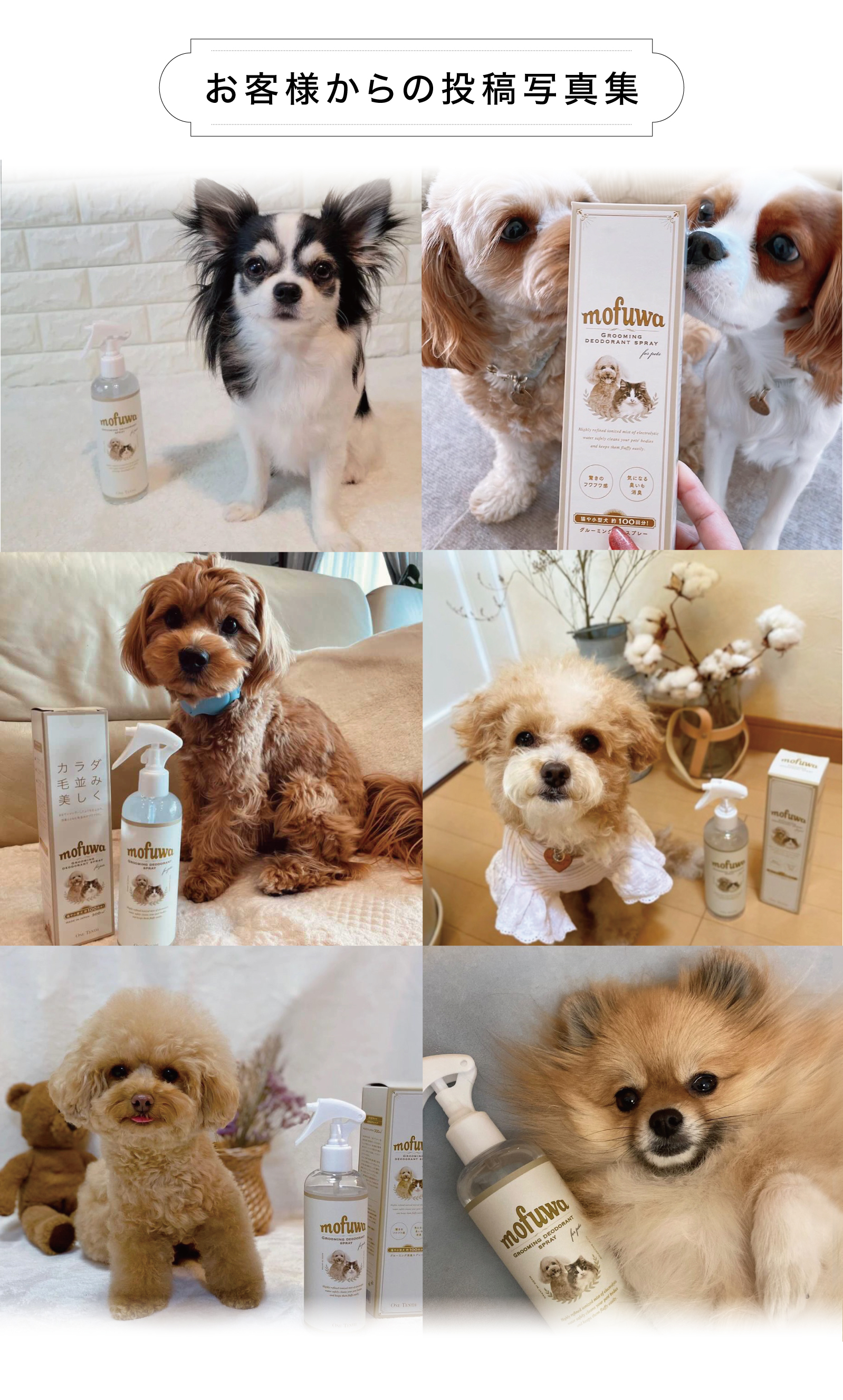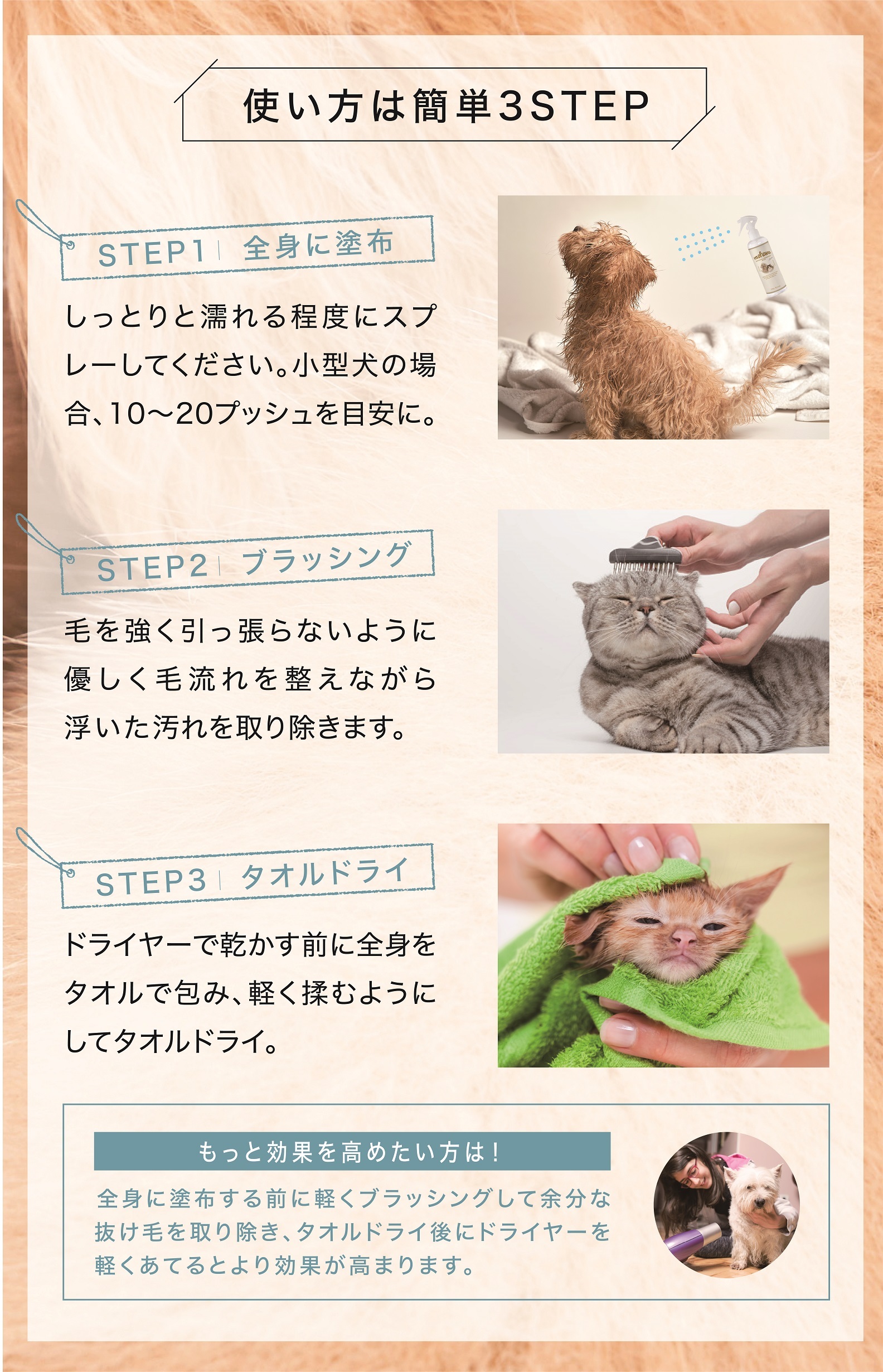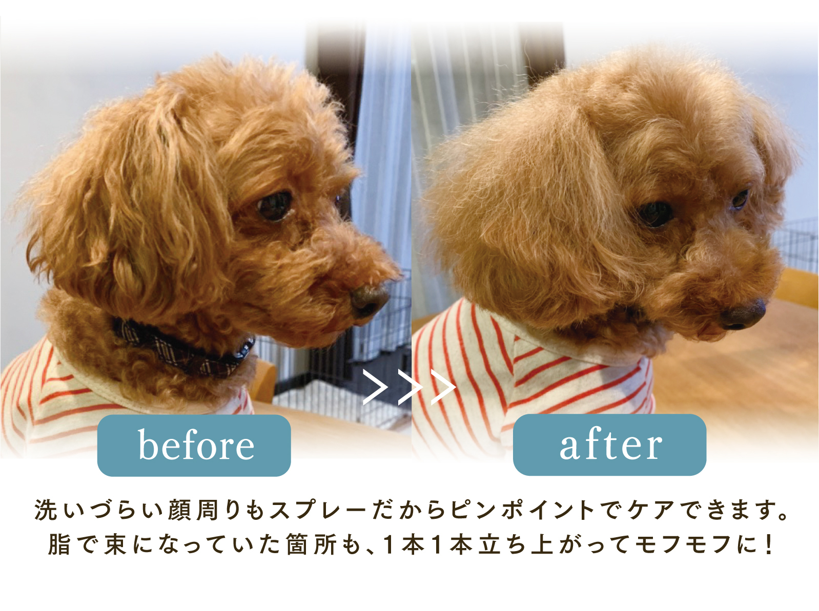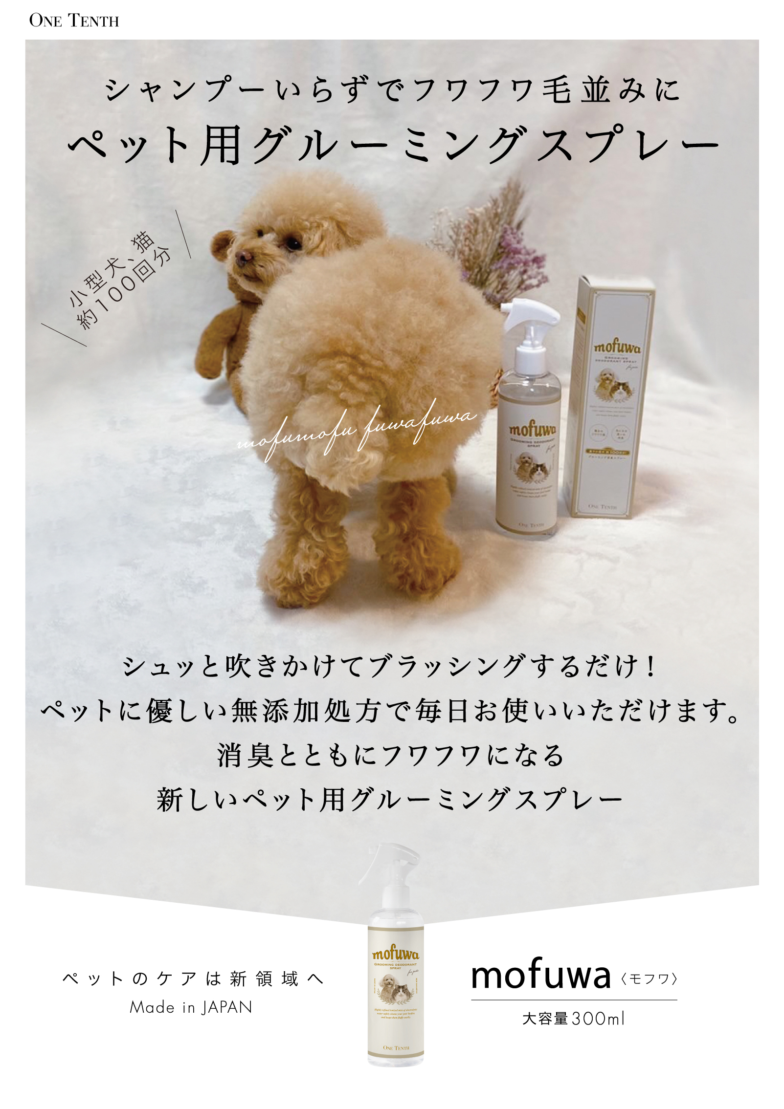 トリマー不要、自宅で手軽に、シャンプーいらずでふわふわの毛並みに! シュッと吹きかけてブラッシングするだけで、皮脂汚れを落とし、ふわふわ・さらさらな毛並みを実現します。 ペットに優しい無香料・無添加処方で毎日お使いいただけます。