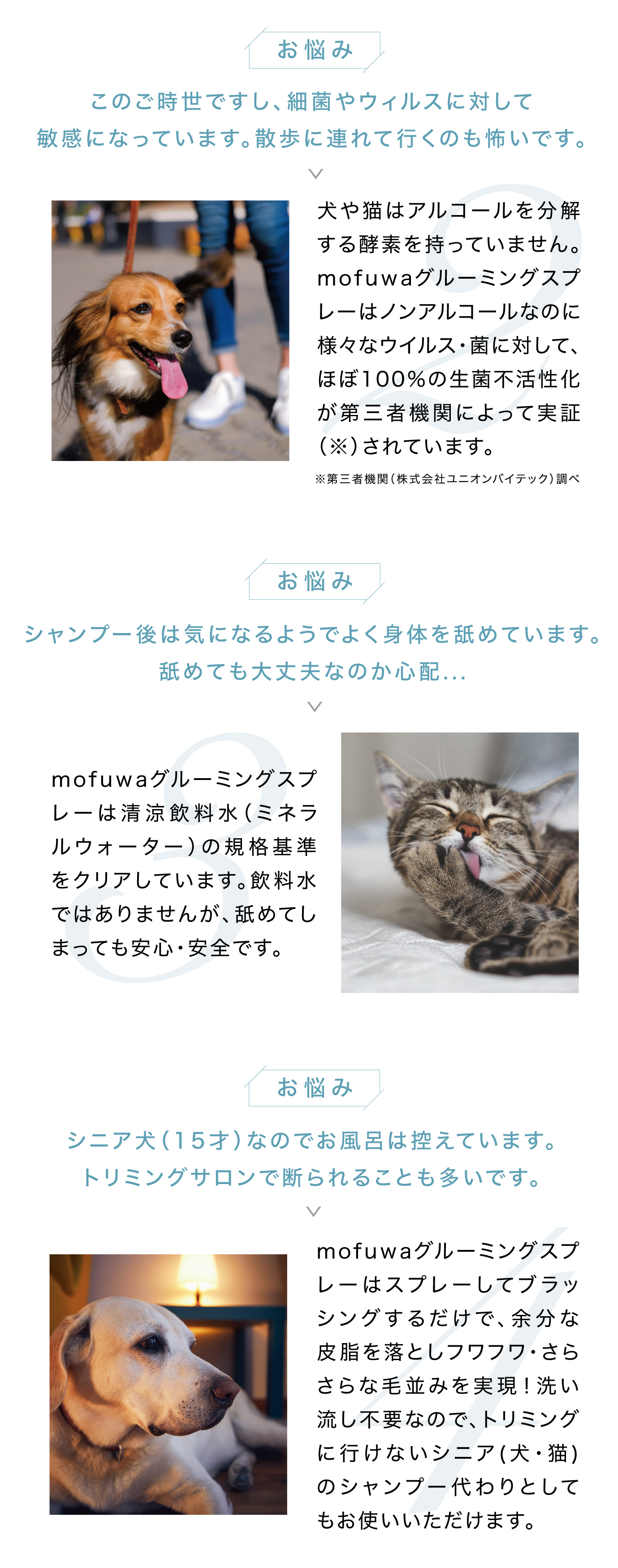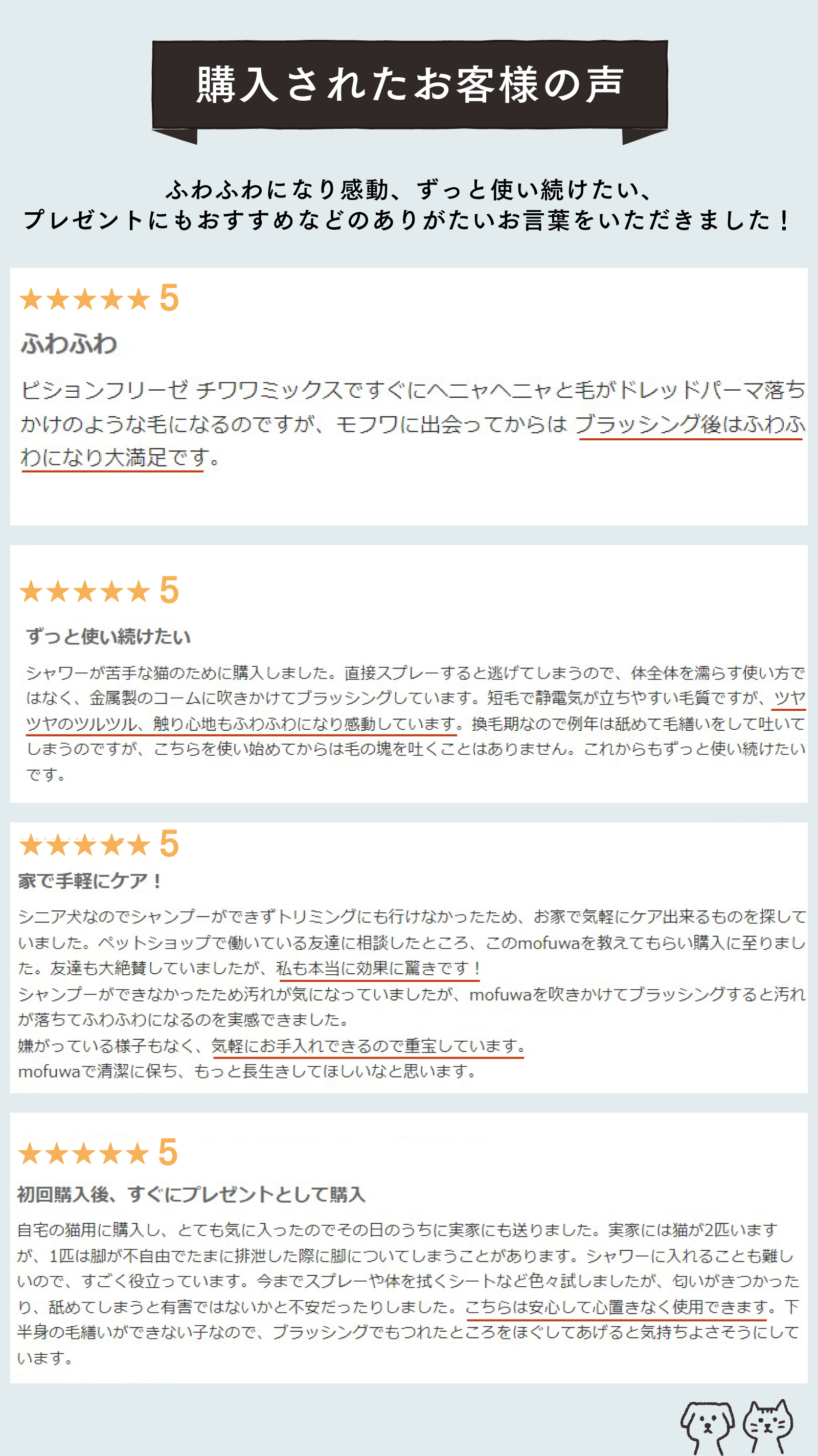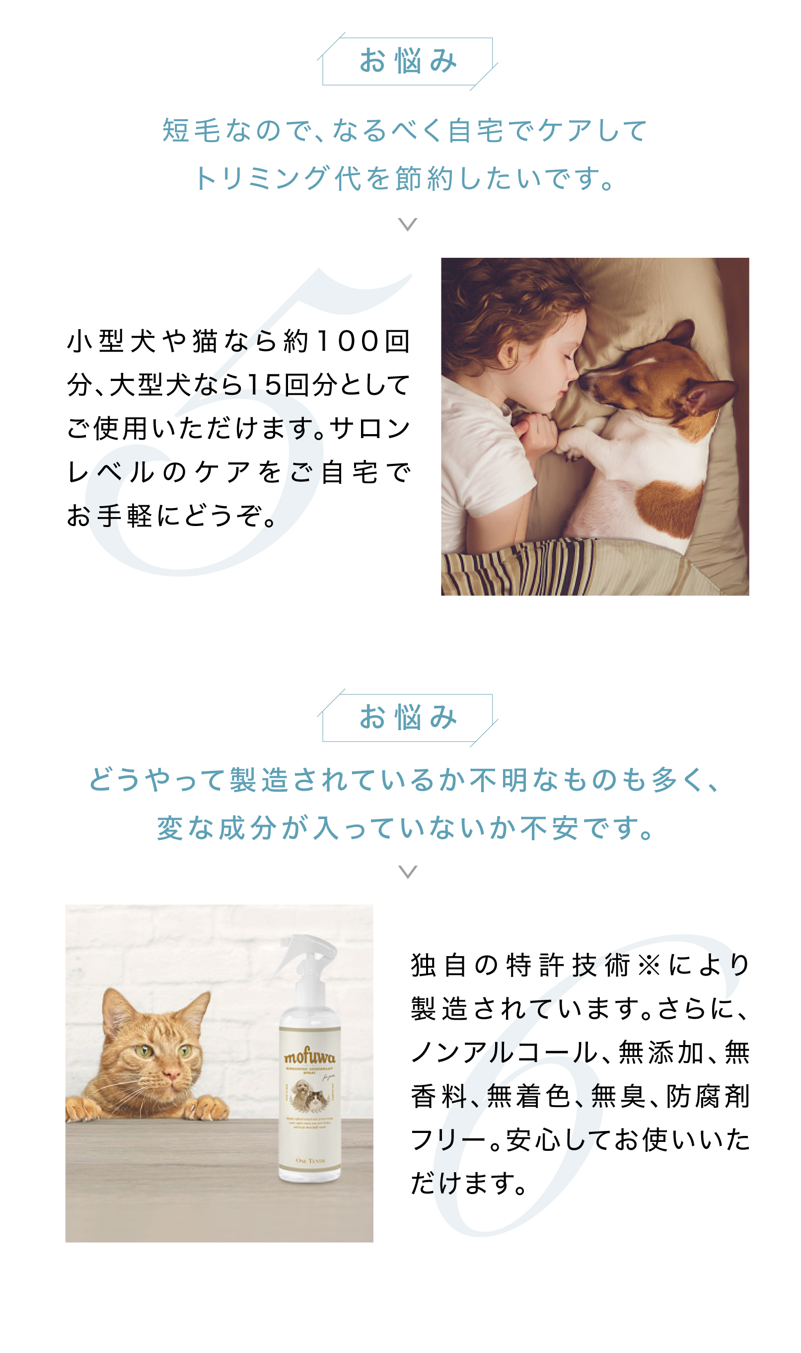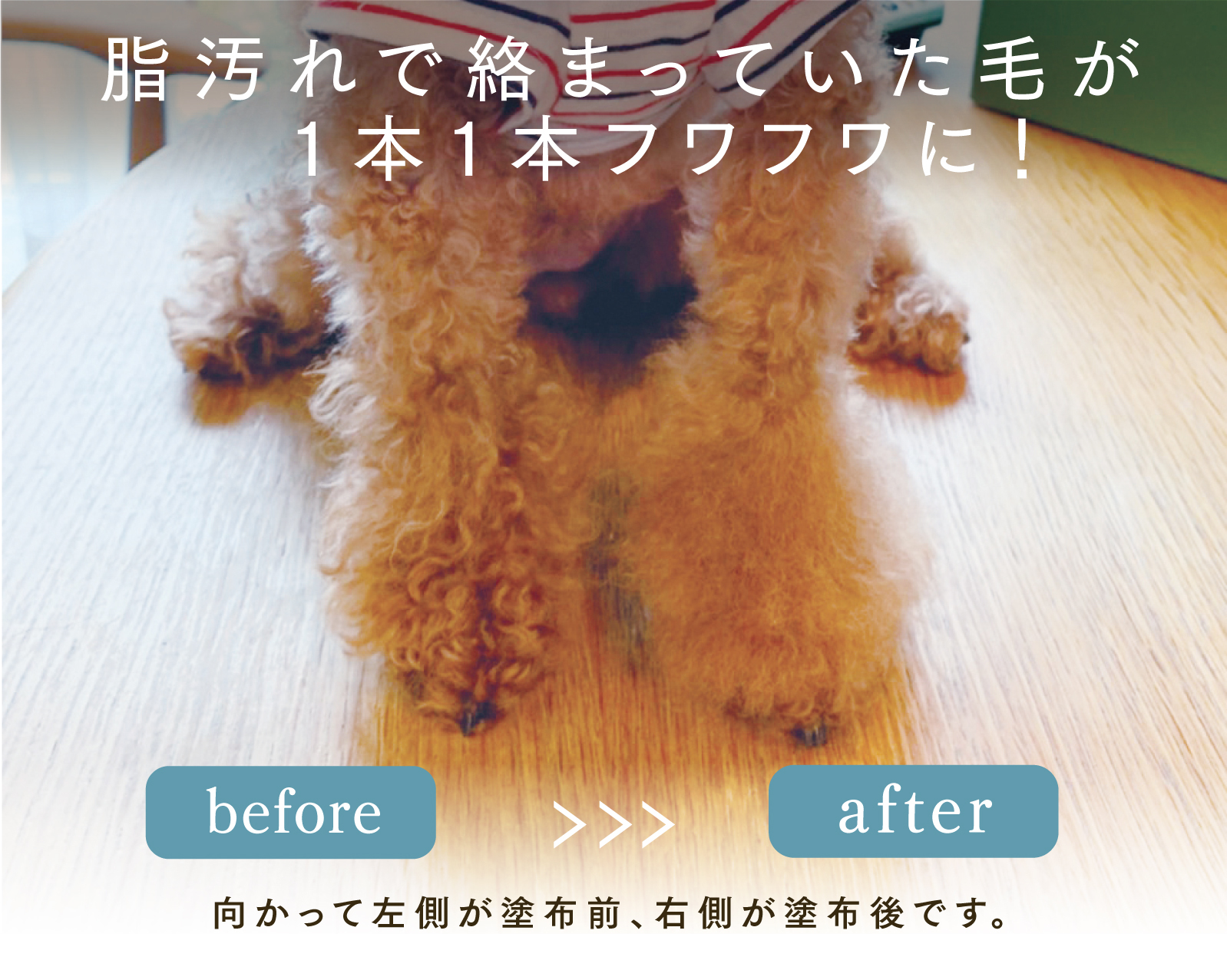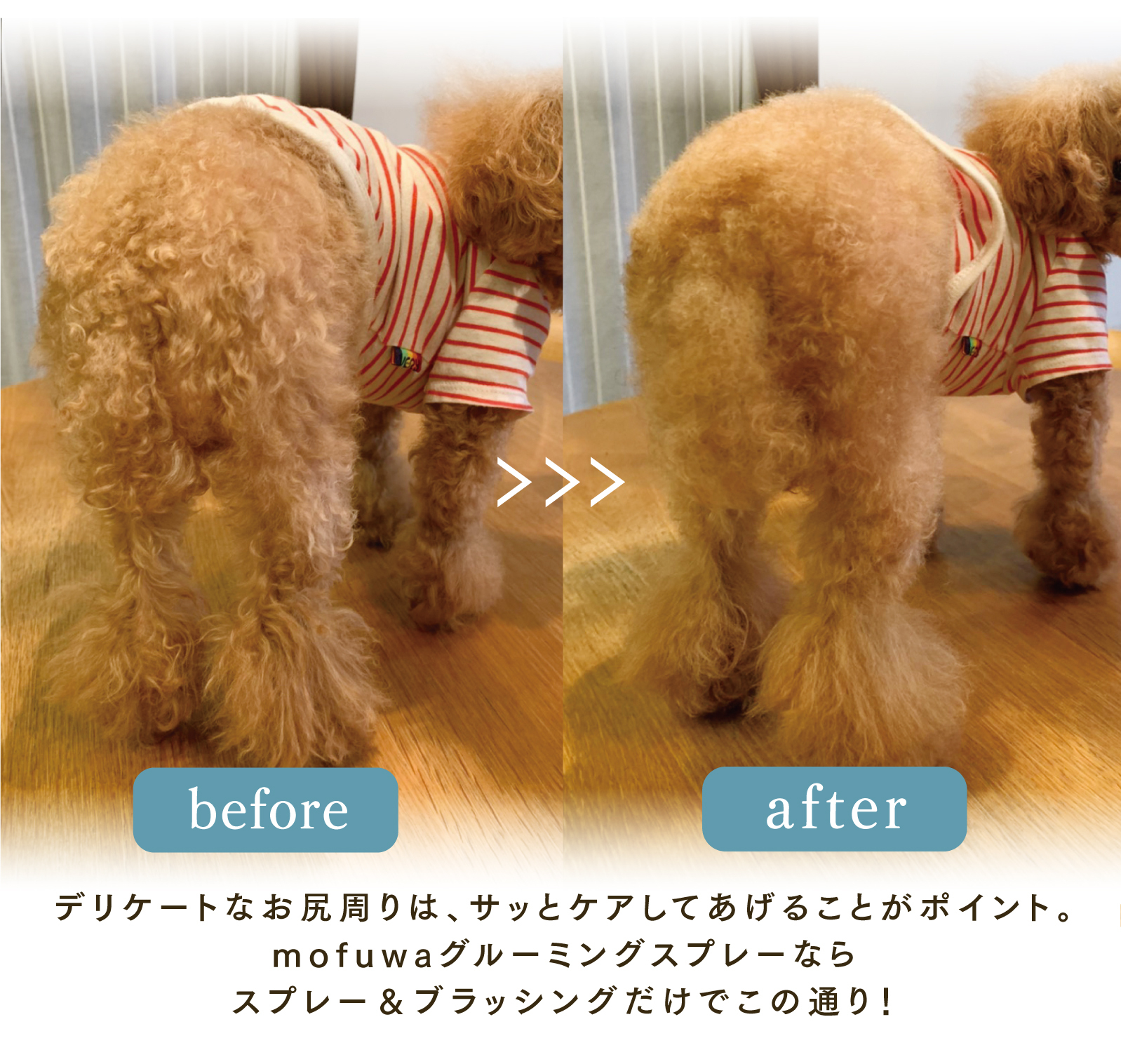 トリマー不要、自宅で手軽に、シャンプーいらずでふわふわの毛並みに! シュッと吹きかけてブラッシングするだけで、皮脂汚れを落とし、ふわふわ・さらさらな毛並みを実現します。 ペットに優しい無香料・無添加処方で毎日お使いいただけます。
