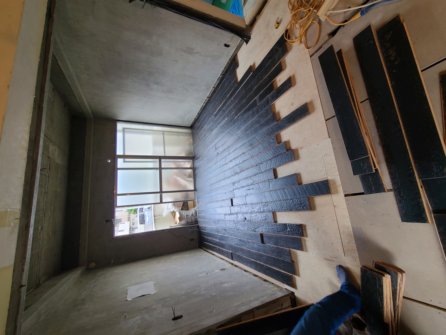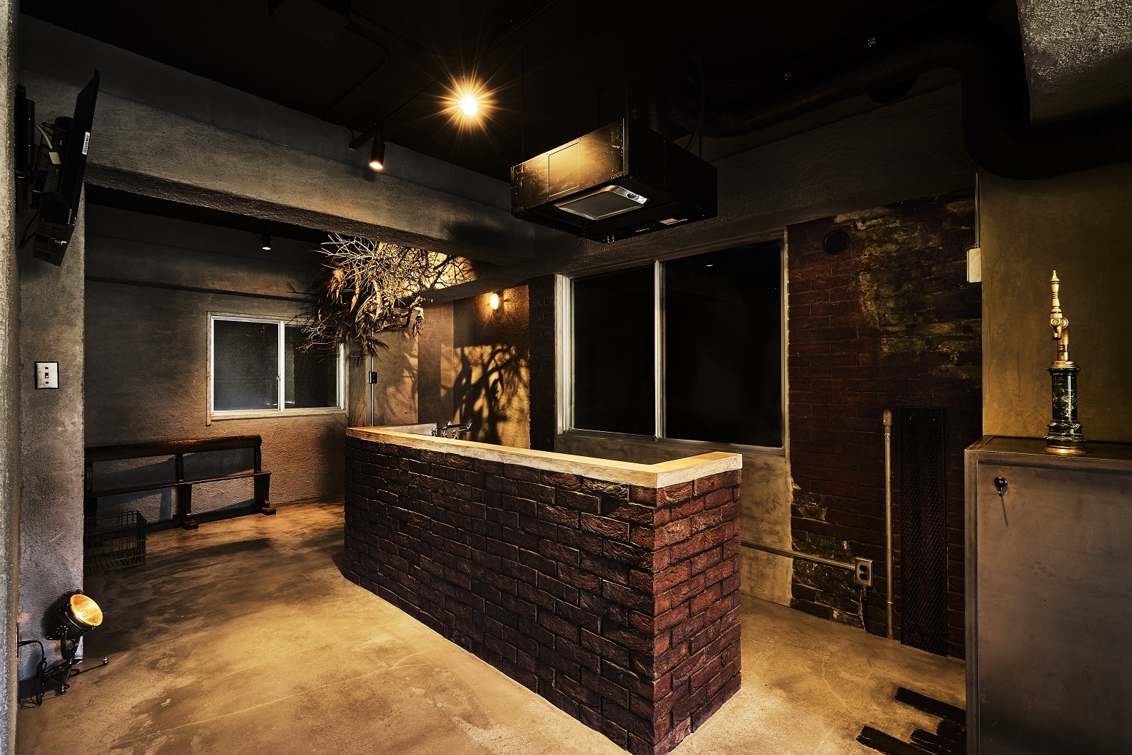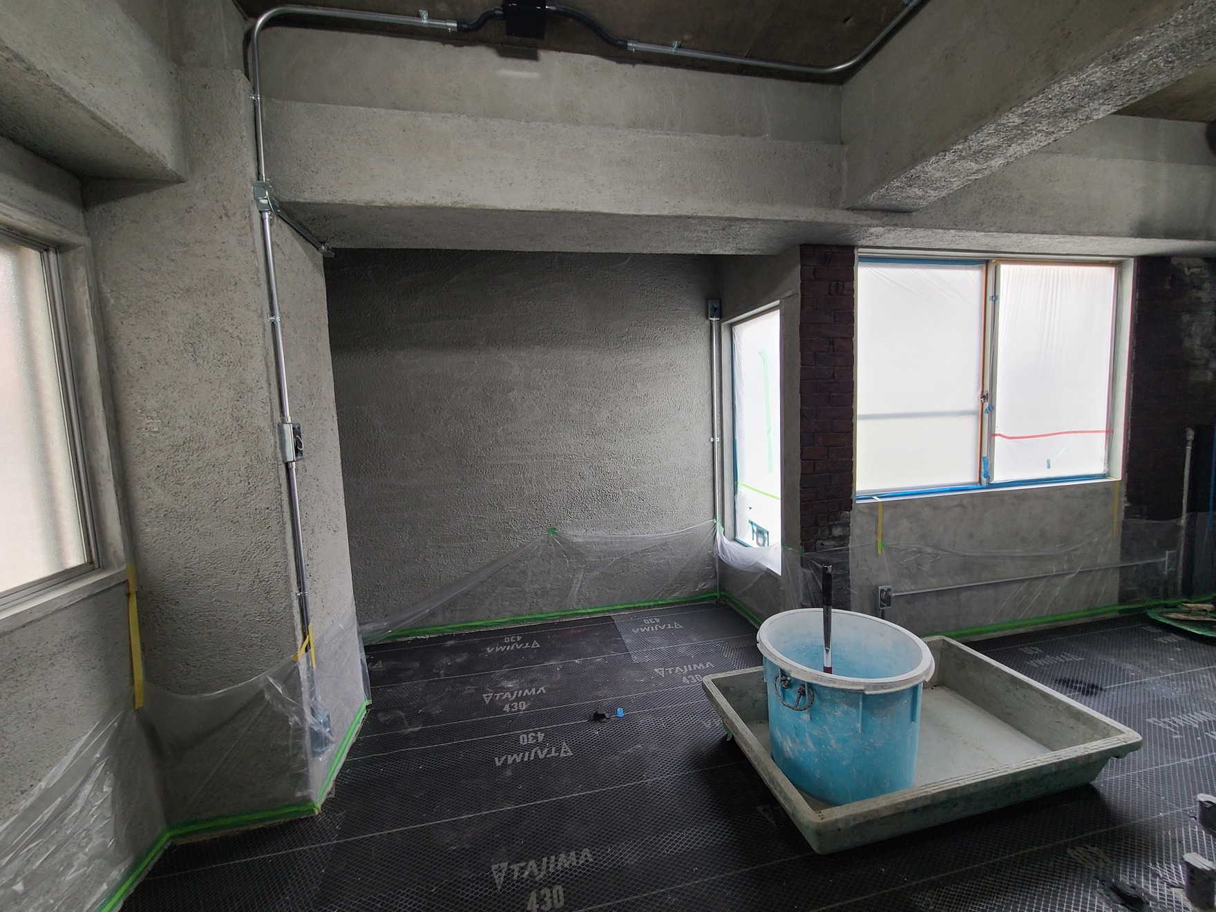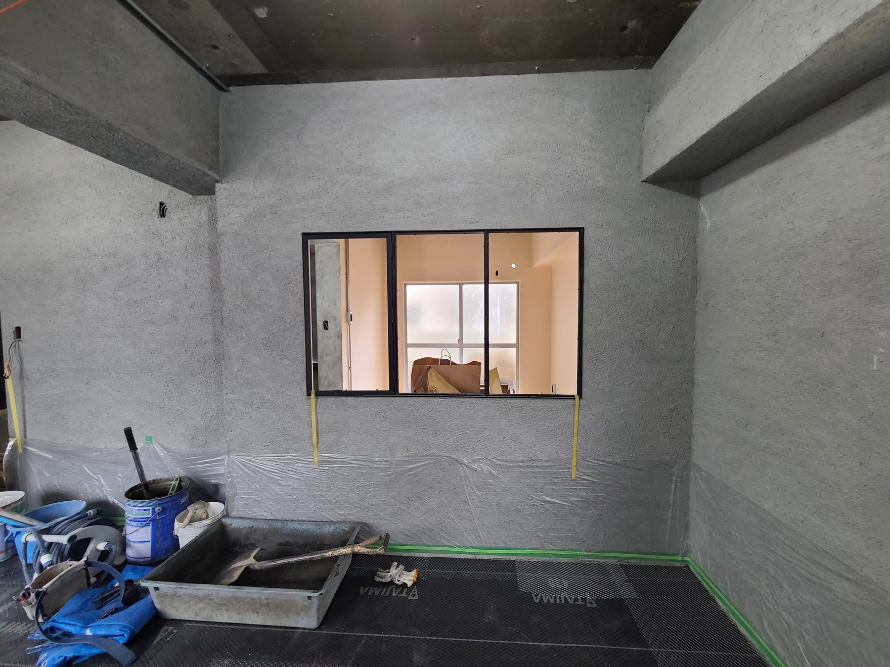 特殊な素材で左官を施しています。色調は墨を混ぜて無骨さを演出。