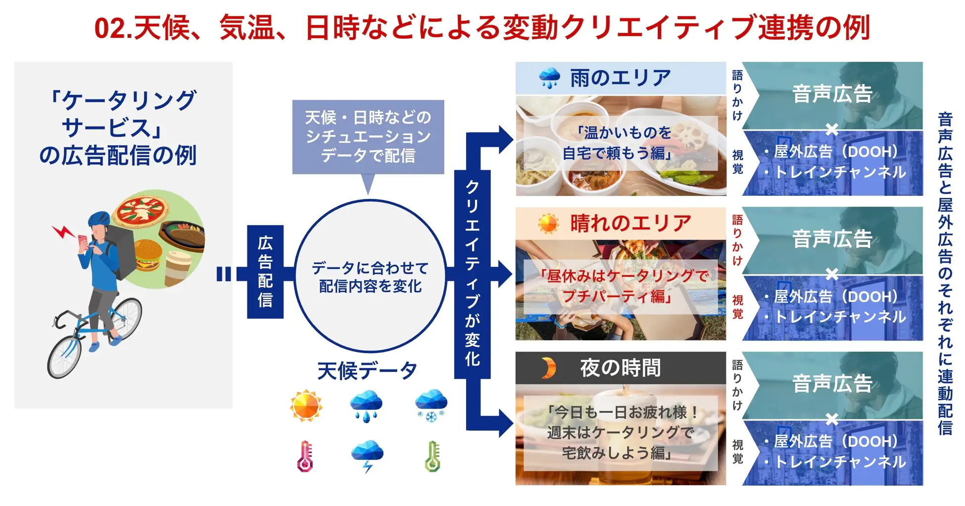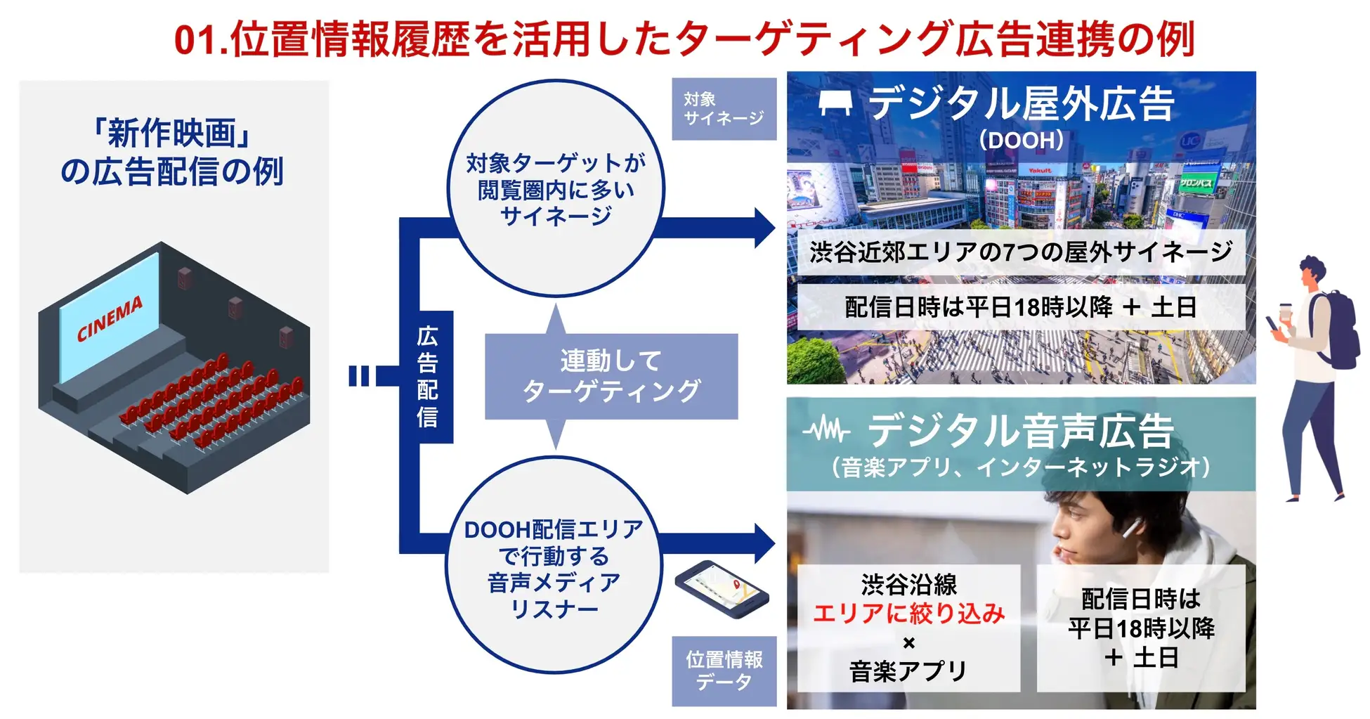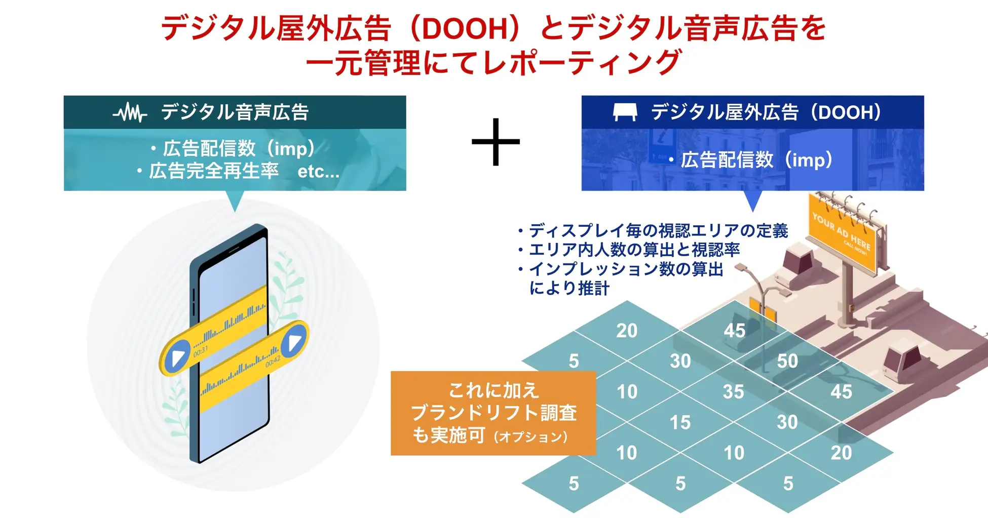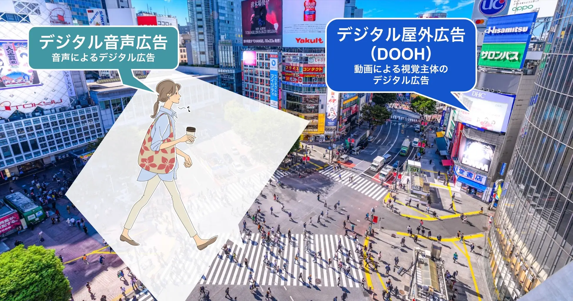 デジタル屋外広告(DOOH)は”動画”による視覚主体の広告フォーマットであり、一方のデジタル音声広告はイヤホンからの”音声のみ”の広告フォーマットであるため、「視覚」と「聴覚」それぞれへの訴求を補完するような広告活用が可能です。