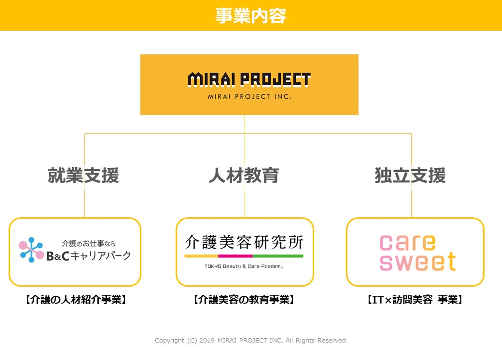 株式会社ミライプロジェクトは「介護×美容」をテーマにした会社です。