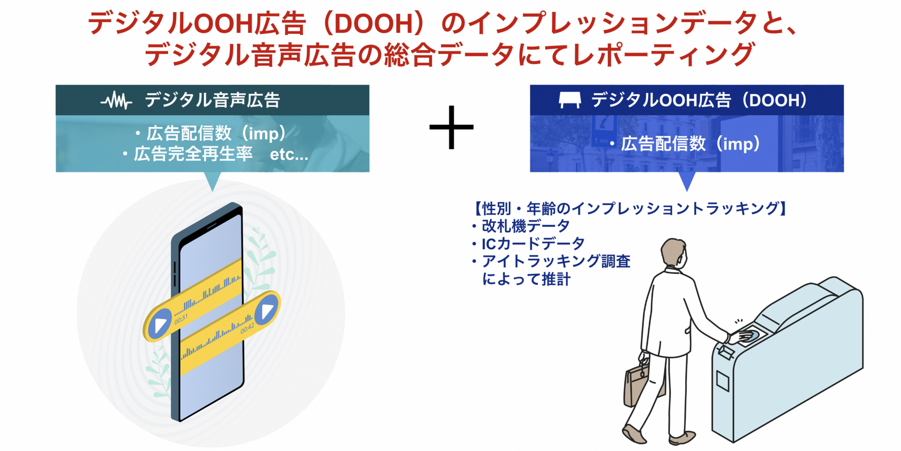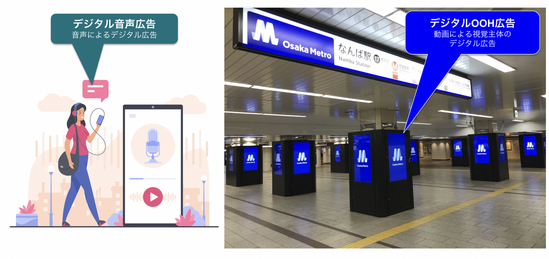 この連携によって、大阪エリアの消費者の行動履歴に応じて交通広告と音声広告を配信できるため、スマホ画面を見ていない状態でも街なかで新たな広告体験を創出します。