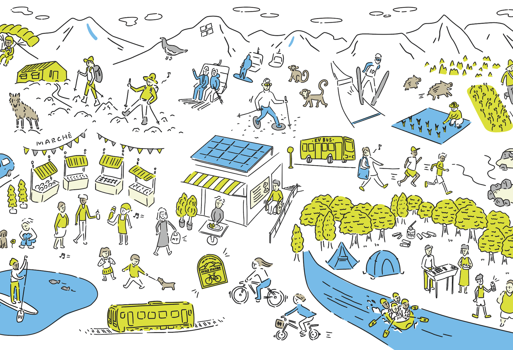 2030年までに取り組む持続可能な社会の様子をイラストで表現し、誰もが気軽に参加できるイメージに仕上げています。