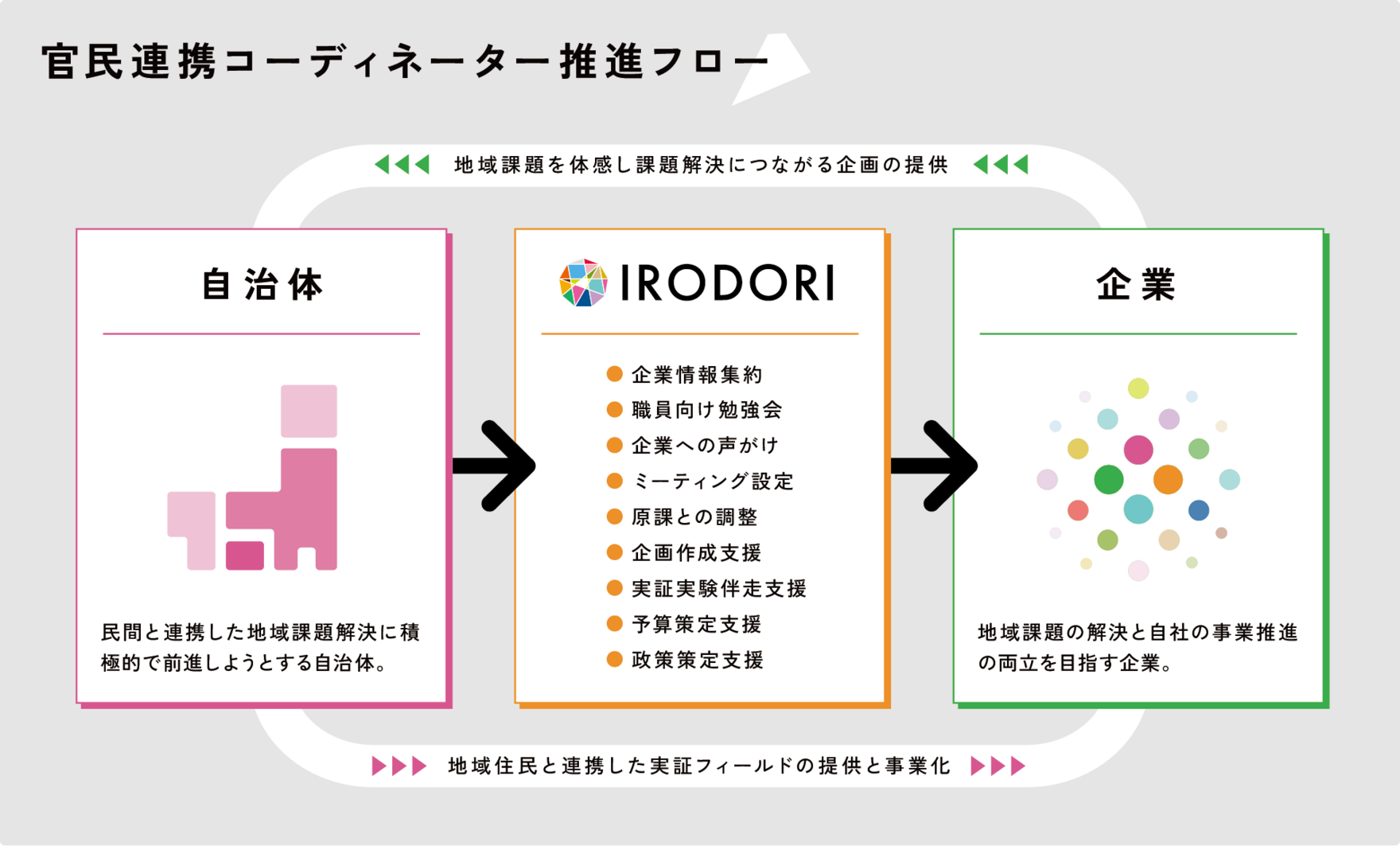 そこで、私たちは課題を解決していきたい行政と課題の解決が可能な企業をつなぎ、持続可能な活動を推進する官民連携コーディネーター(アドバイザー)として活動しています。