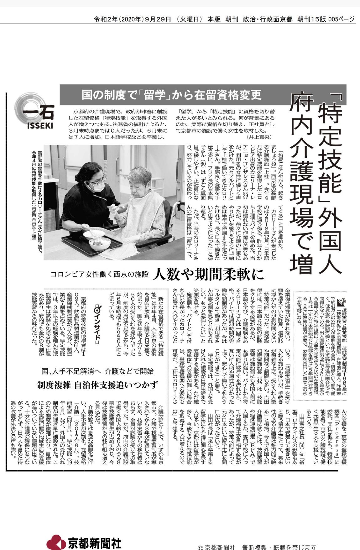 介護現場で活躍する外国人の様子を京都新聞さんに取材して頂きました。