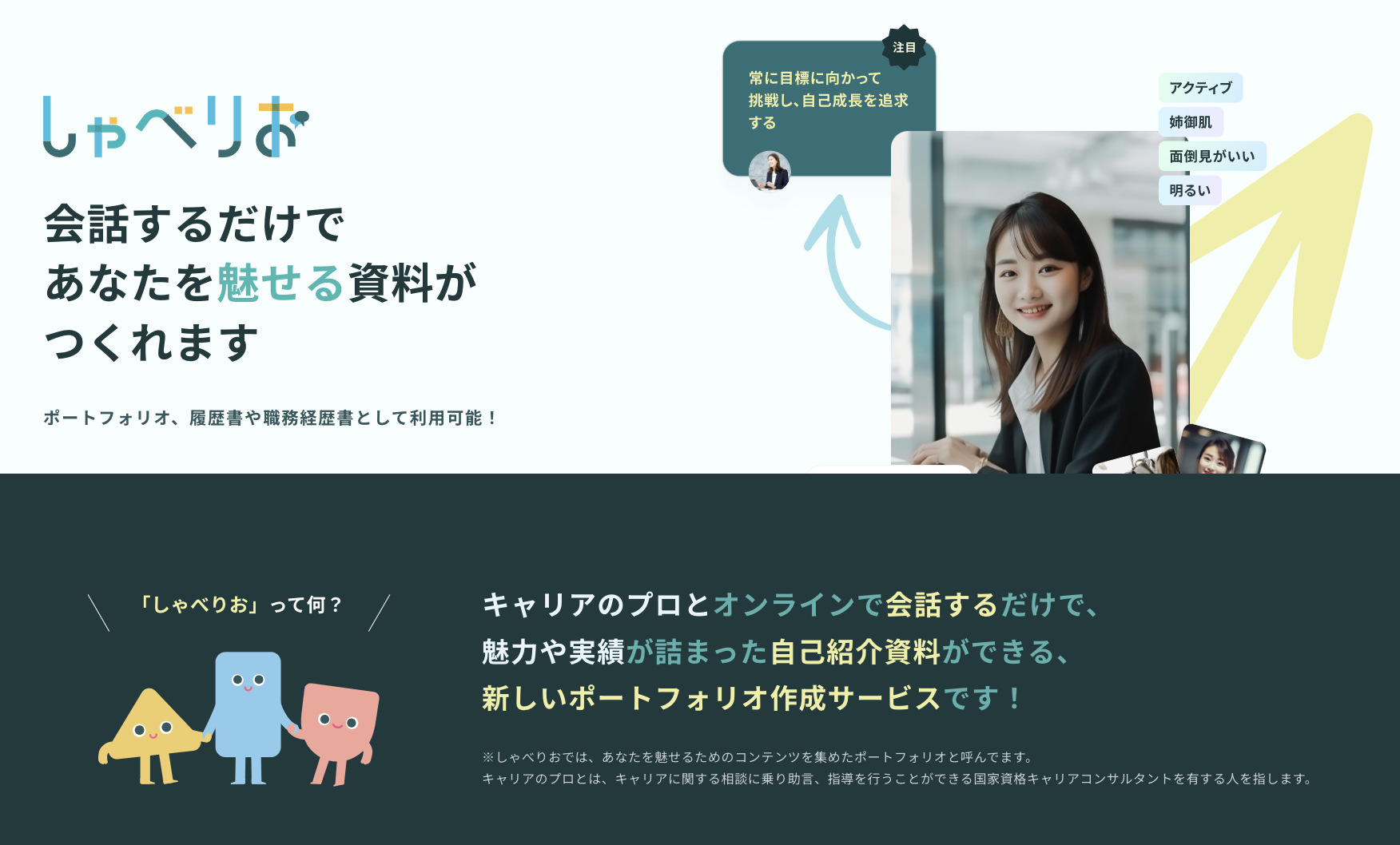 国家資格キャリアコンサルタントに無料でキャリア相談をオンラインで実施し、自己PRや強み、職務経歴をポートフォリオ化してくれるWEBサービス。