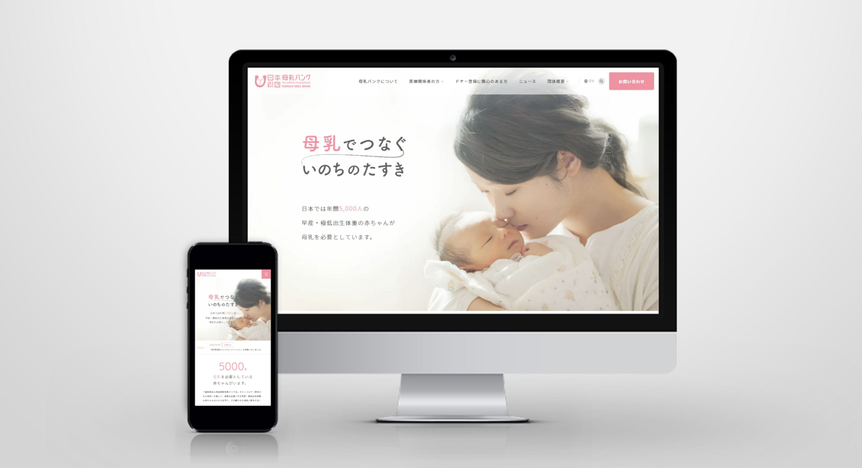 日本財団母乳バンクらしさを表現したデザインと、医療関係者やドナー提供者、利用者やメディアを含めたコンテンツ設計によるWebサイトの構築をご提案。
