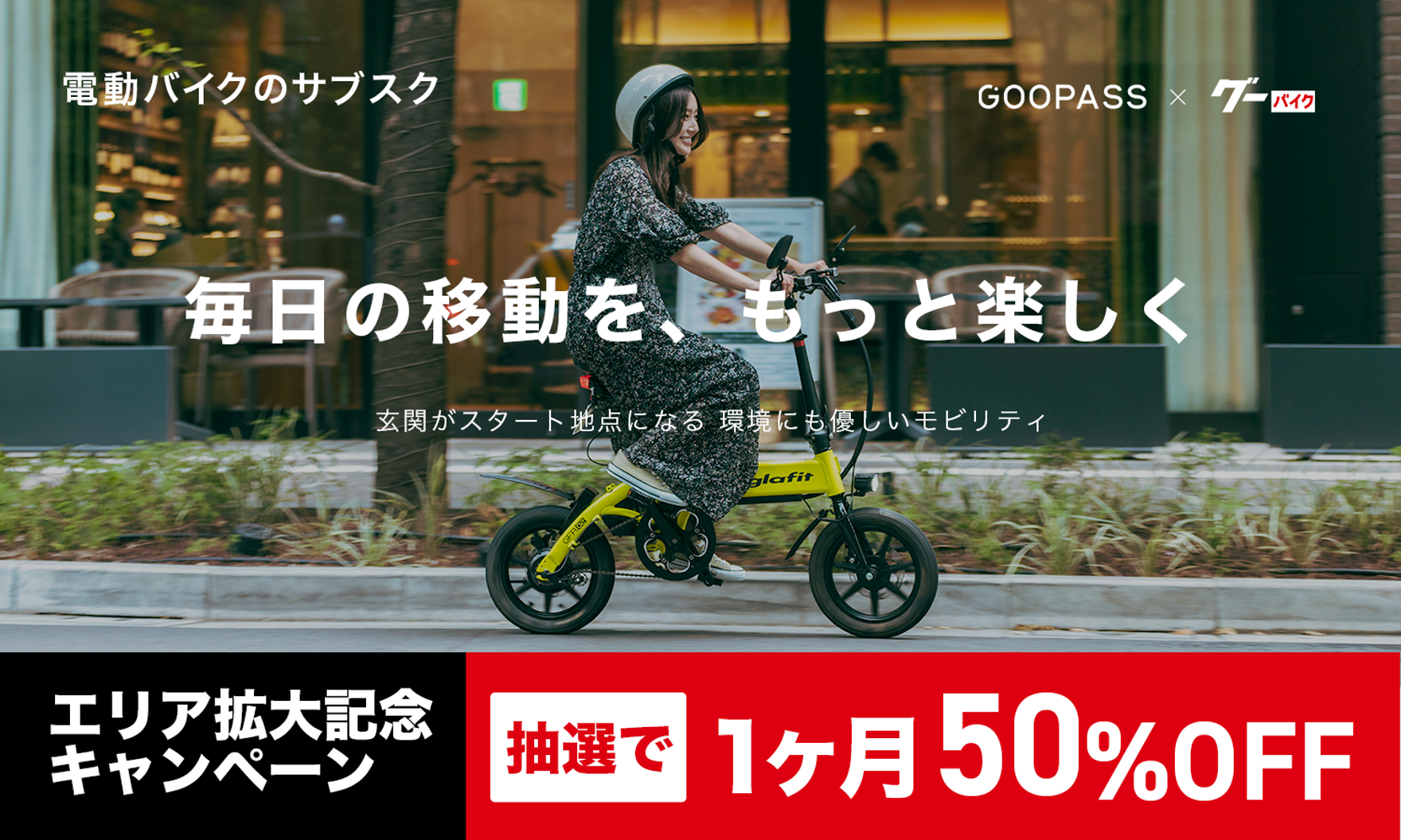 カメラのサブスク「GOOPASS」を展開するカメラブ株式会社は、情報量国内最⼤級のバイク情報メディア「グーバイク」を運営している株式会 社プロトコーポレーションと実施している電動バイクおよび電動キックボード等のサブスク実証実験の対象を東京および東海エリアへ拡大いたします。エリア拡大を記念してキャンペーン実施すべての電動バイクおよび電動キックボードの月額料金を50%OFFするキャンペーンを実施しました。