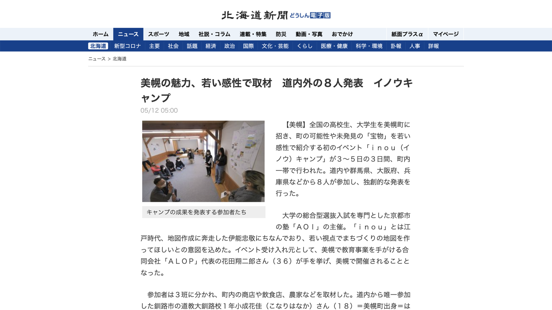 町の可能性や未発見の「宝物」を若い感性で紹介する初のイベント「inouキャンプ」が取り上げられました。「inou」とは江戸時代、地図作成に奔走した伊能忠敬にちなんでおり、若い視点でまちづくりの地図を作ってほしいとの意図を込めています。