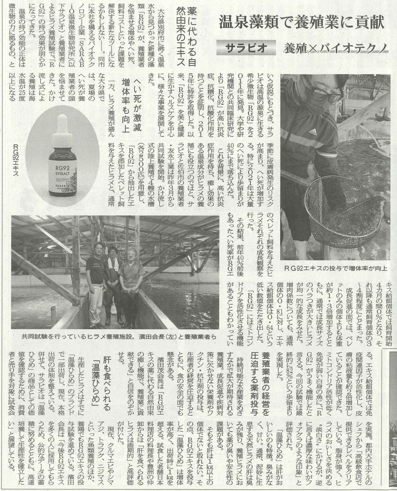 「温泉藻類RG92」エキスが、ヒラメの成長を大幅に促進し、自然免疫を活性化させてへい死率を大幅に抑える効果があるという研究結果が得られました。