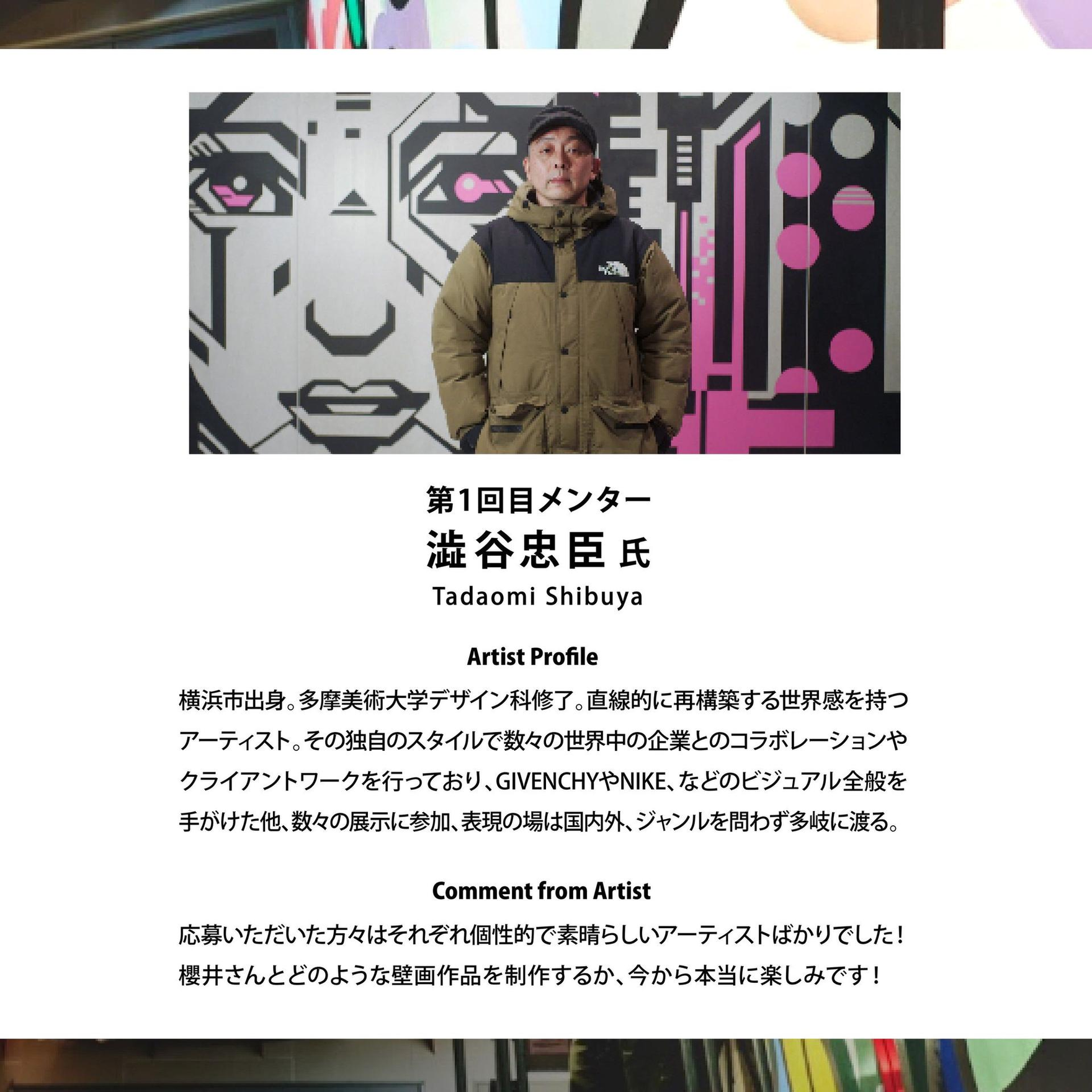 第一回は澁谷忠臣さん (https://www.instagram.com/tadaomishibuya) をメンターとして迎え、アーティストセレクション、ラフ画作成、実際の現場での制作等、サポートいただきました。