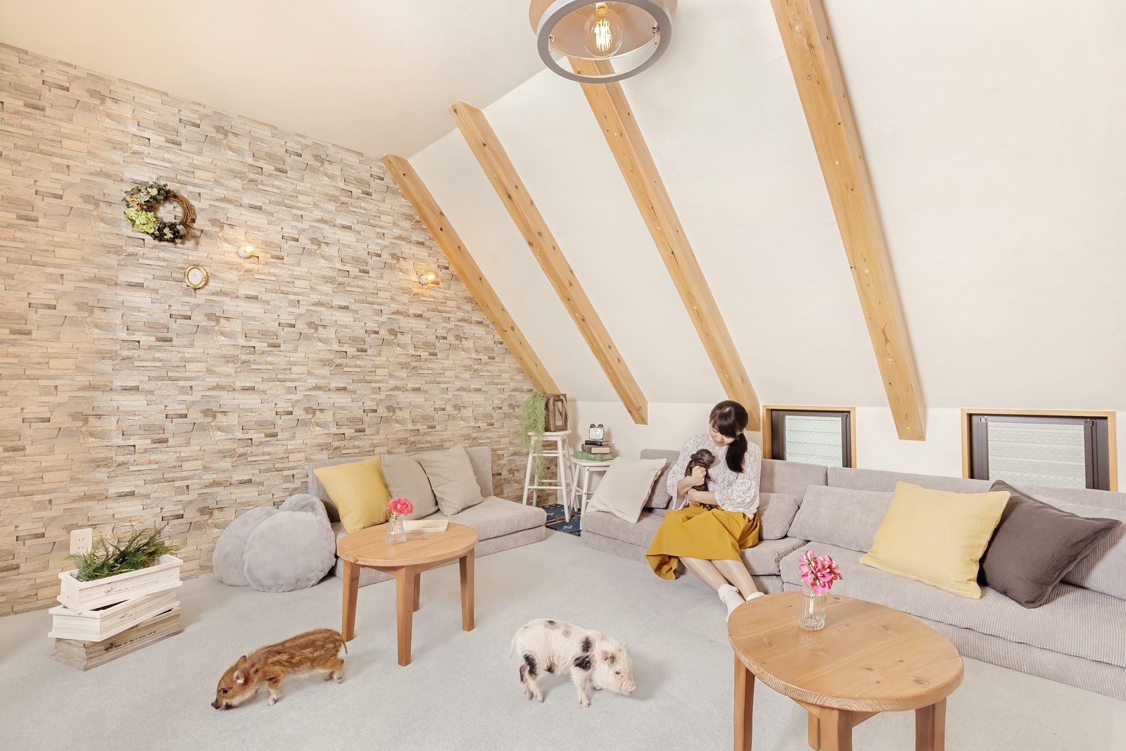 「マイクロブタさんのおうち」をコンセプトとし、まるで自宅のリビングルームにいるような気分で、ブタさんとのお時間をお楽しみいただけます。