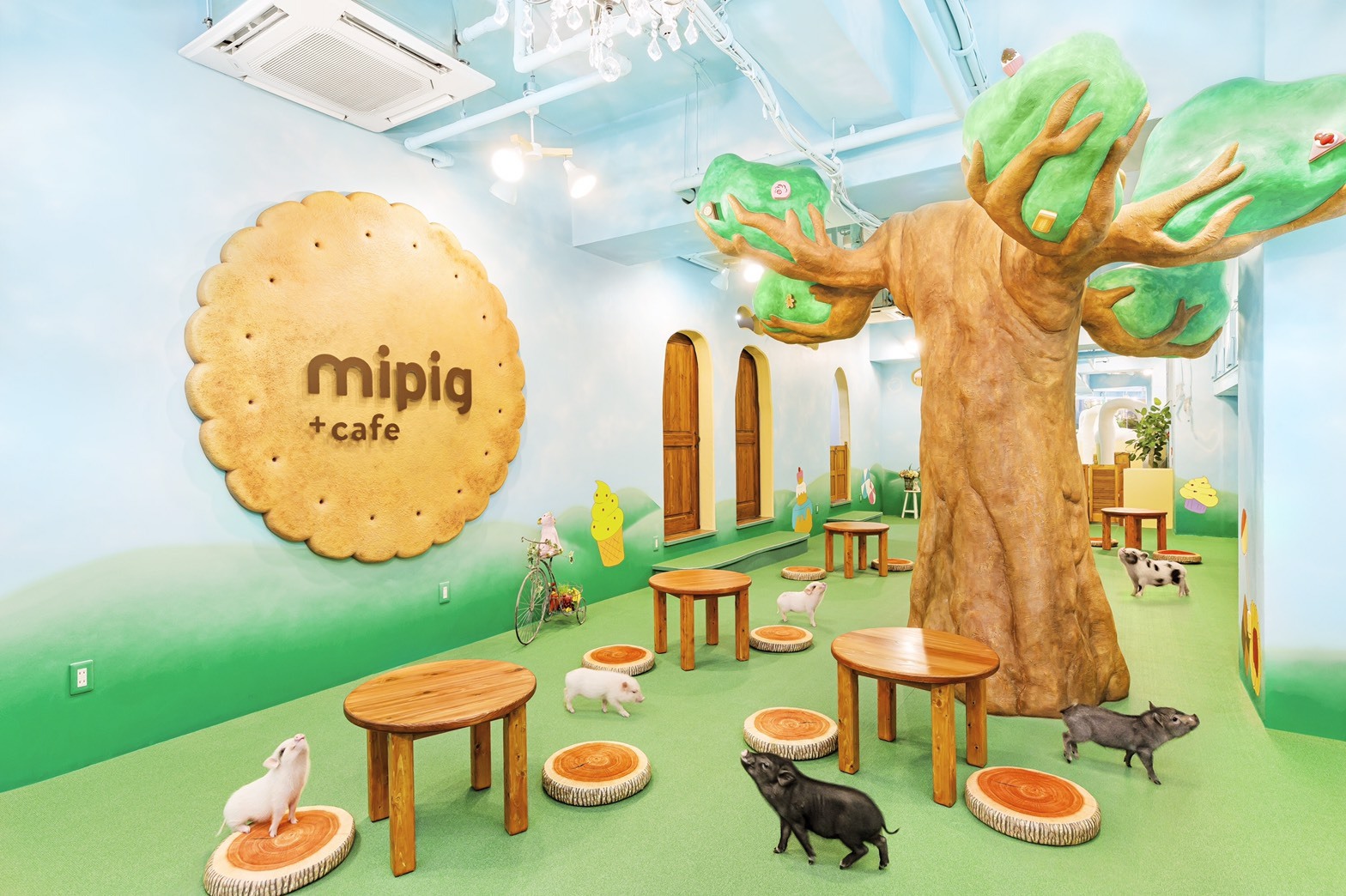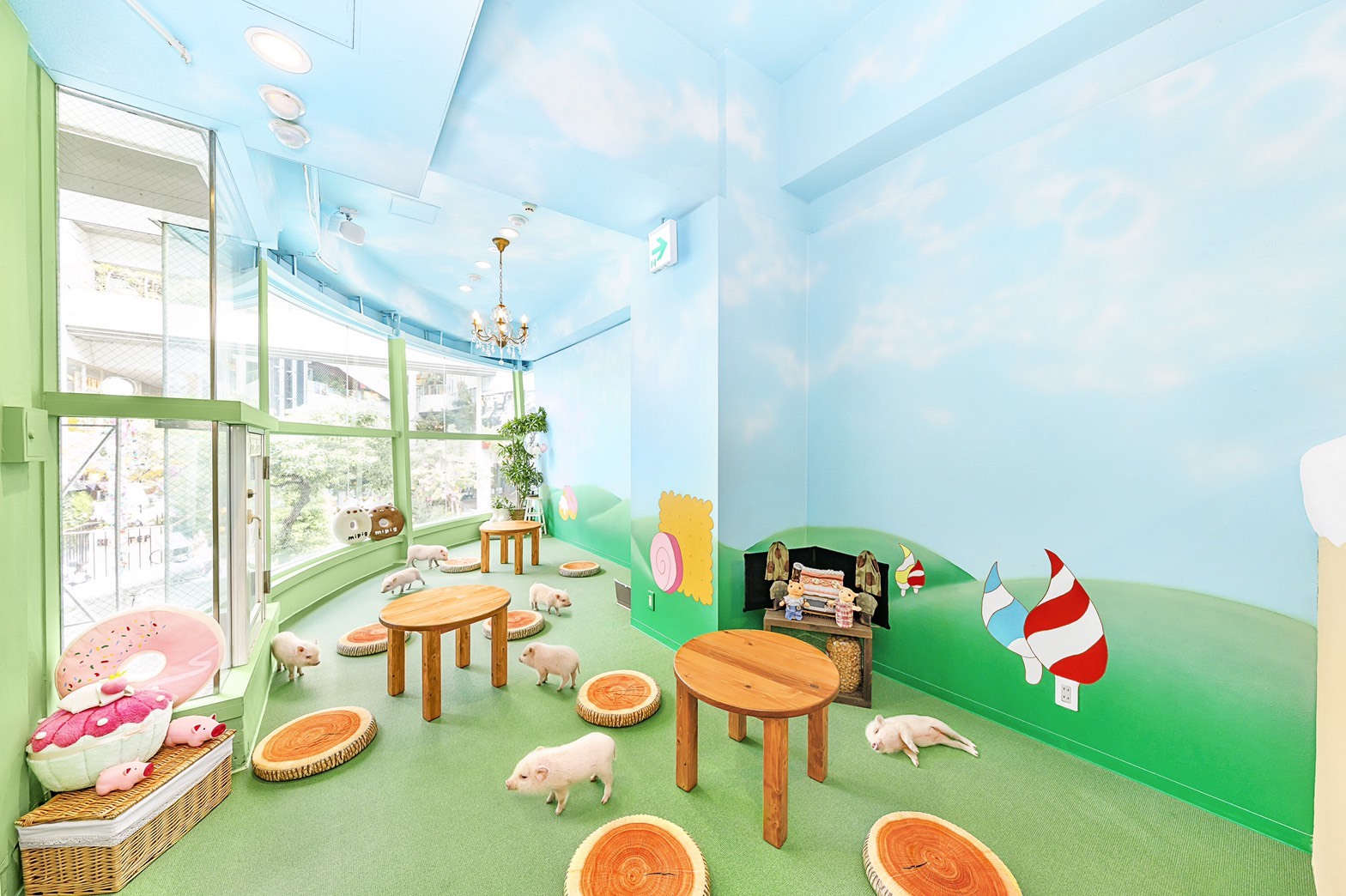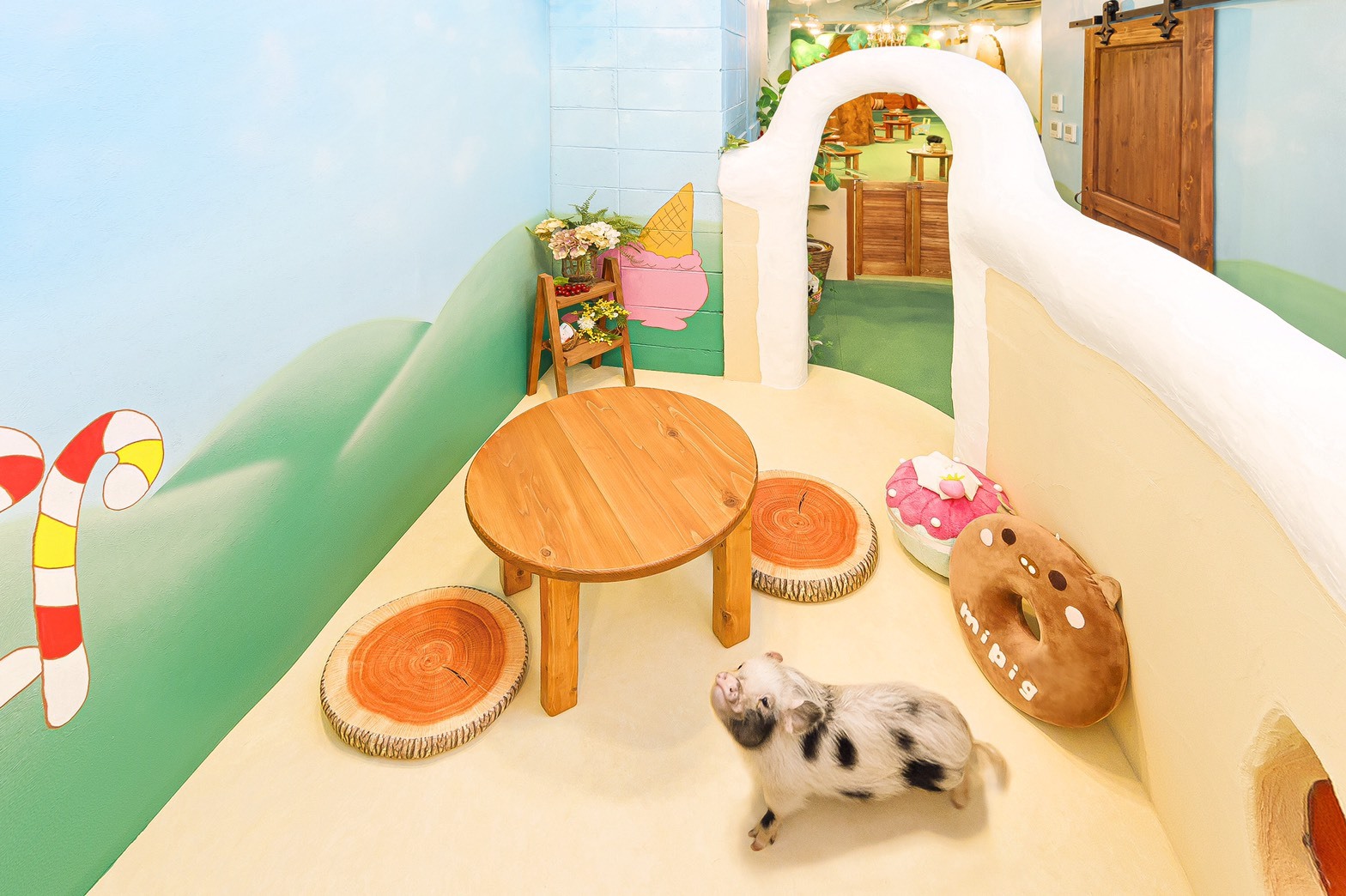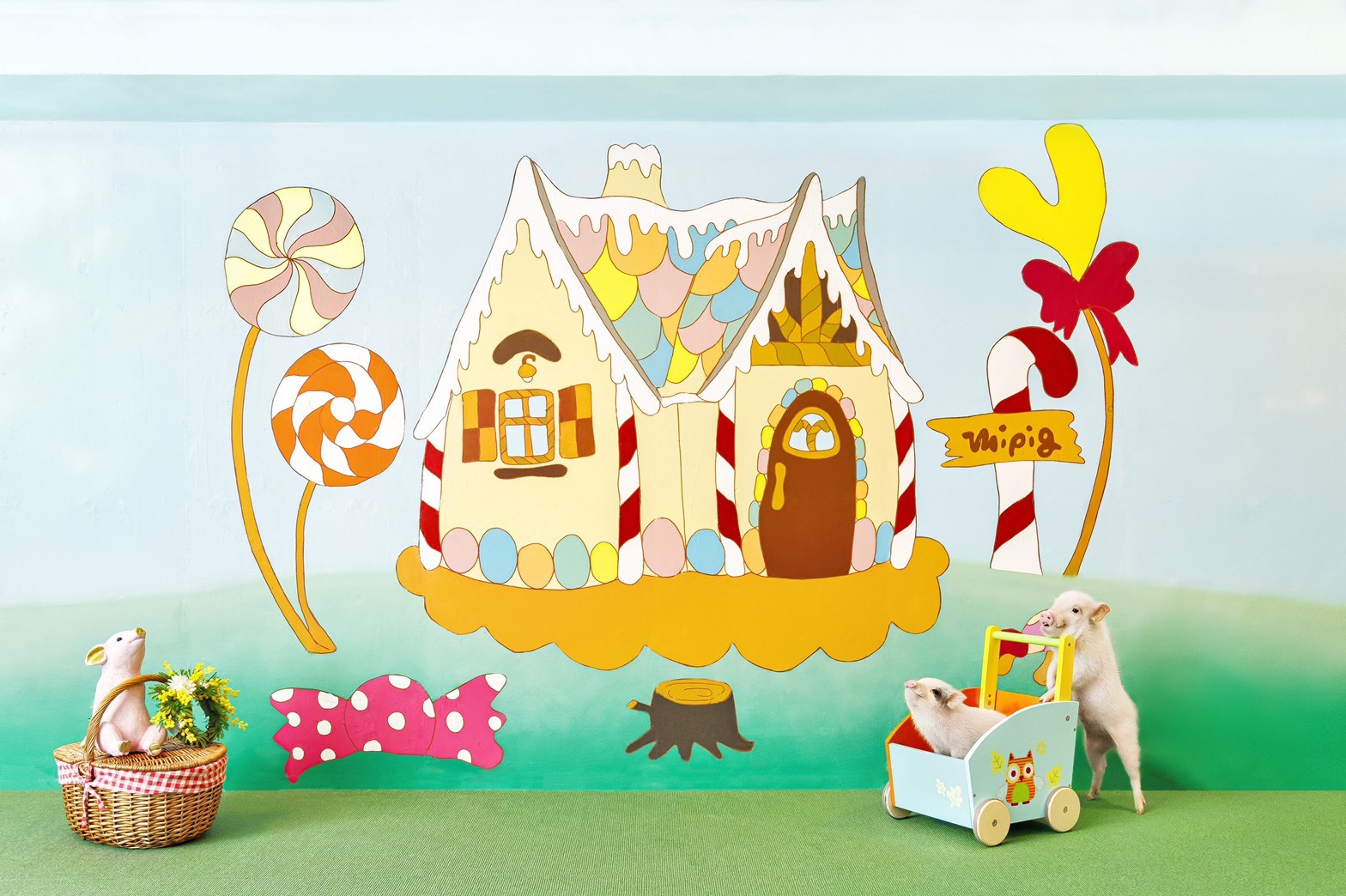 「お菓子のおうち」がコンセプトで、まるでヘンゼルとグレーテルの絵本の世界にいる気分で、ブタさんとのお時間をお楽しみいただけます。