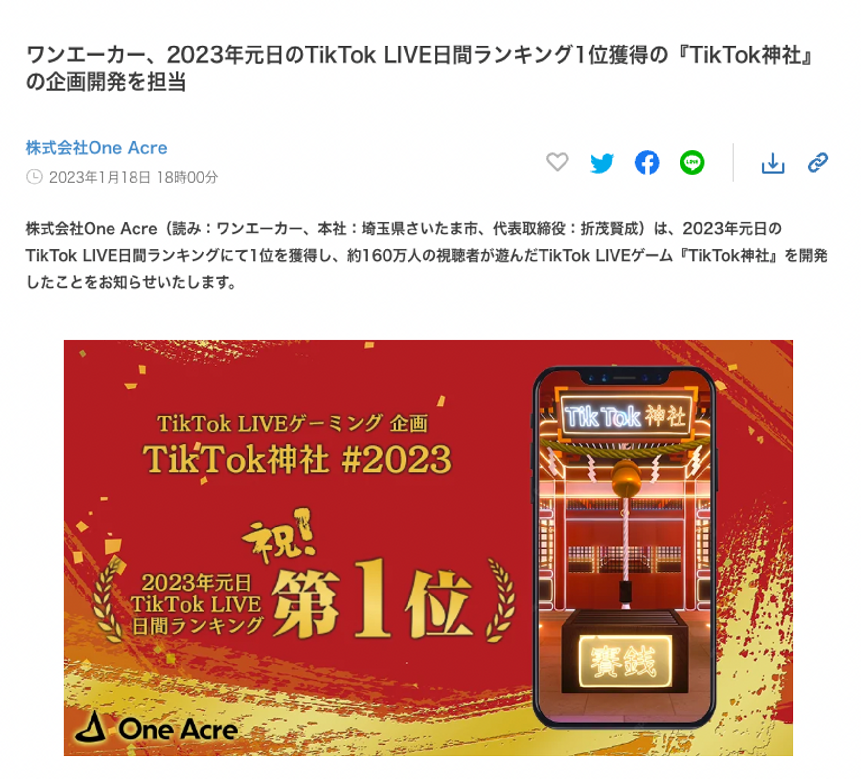ワンエーカー、2023年元日のTikTok LIVE日間ランキング1位獲得の『TikTok神社』の企画開発を担当