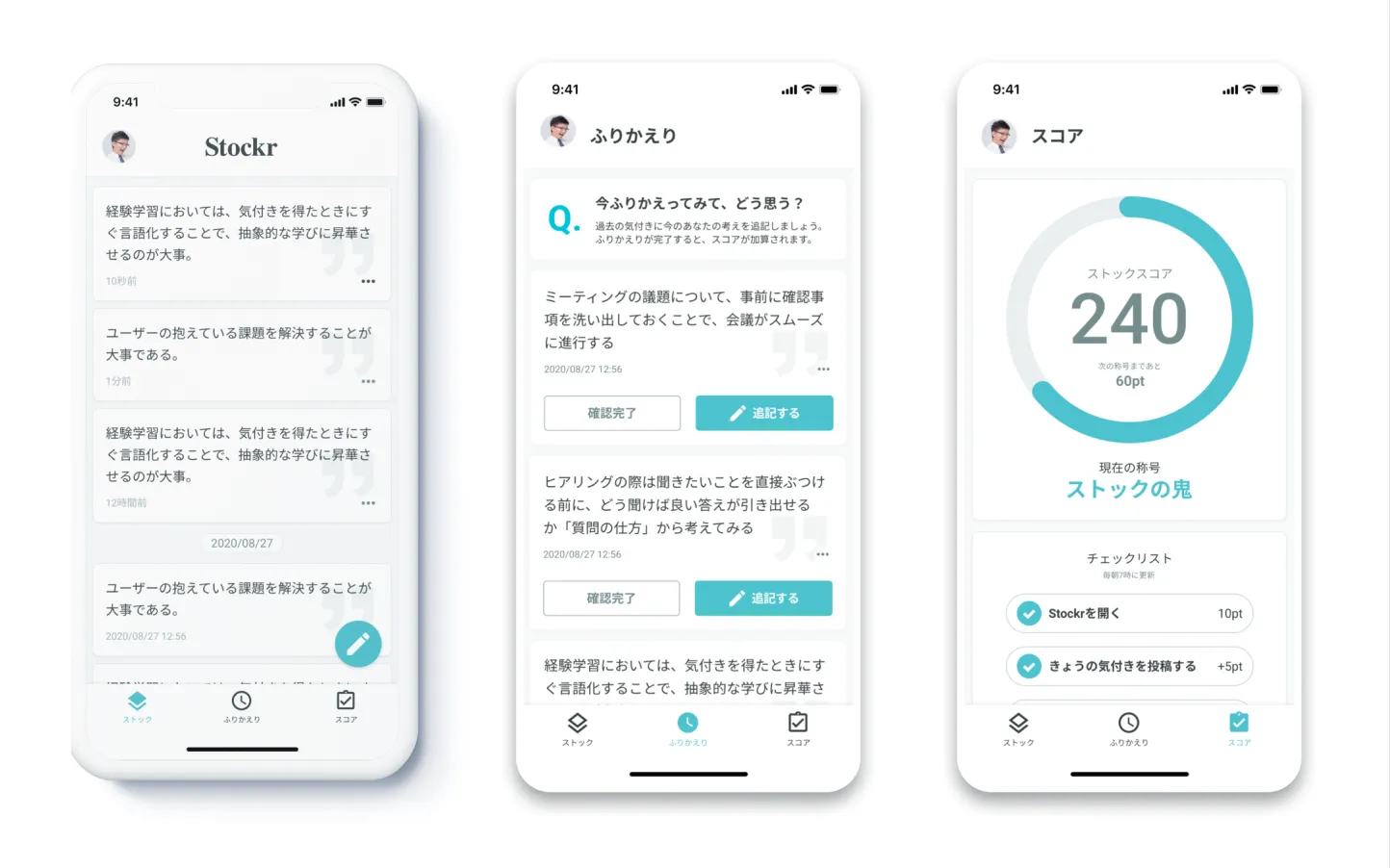 Stockrは日々の気づきを端的なテキストで素早く棚卸しし、それらの定期的な振り返りをリマインド機能で促します。ふりかえりを習慣化ことで気づきを磨き、自己理解や自己成長へと繋げていくことができます。