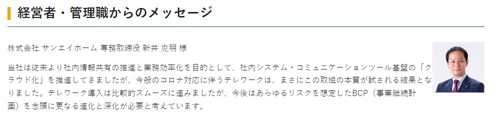 埼玉県テレワークポータルサイトへ掲載されました。 当社ではDX推進室及び営業推進課などの一部の部門でテレワークを導入しています。 出産後のテレワークや時短勤務など柔軟な働き方ができるよう環境を整えています。