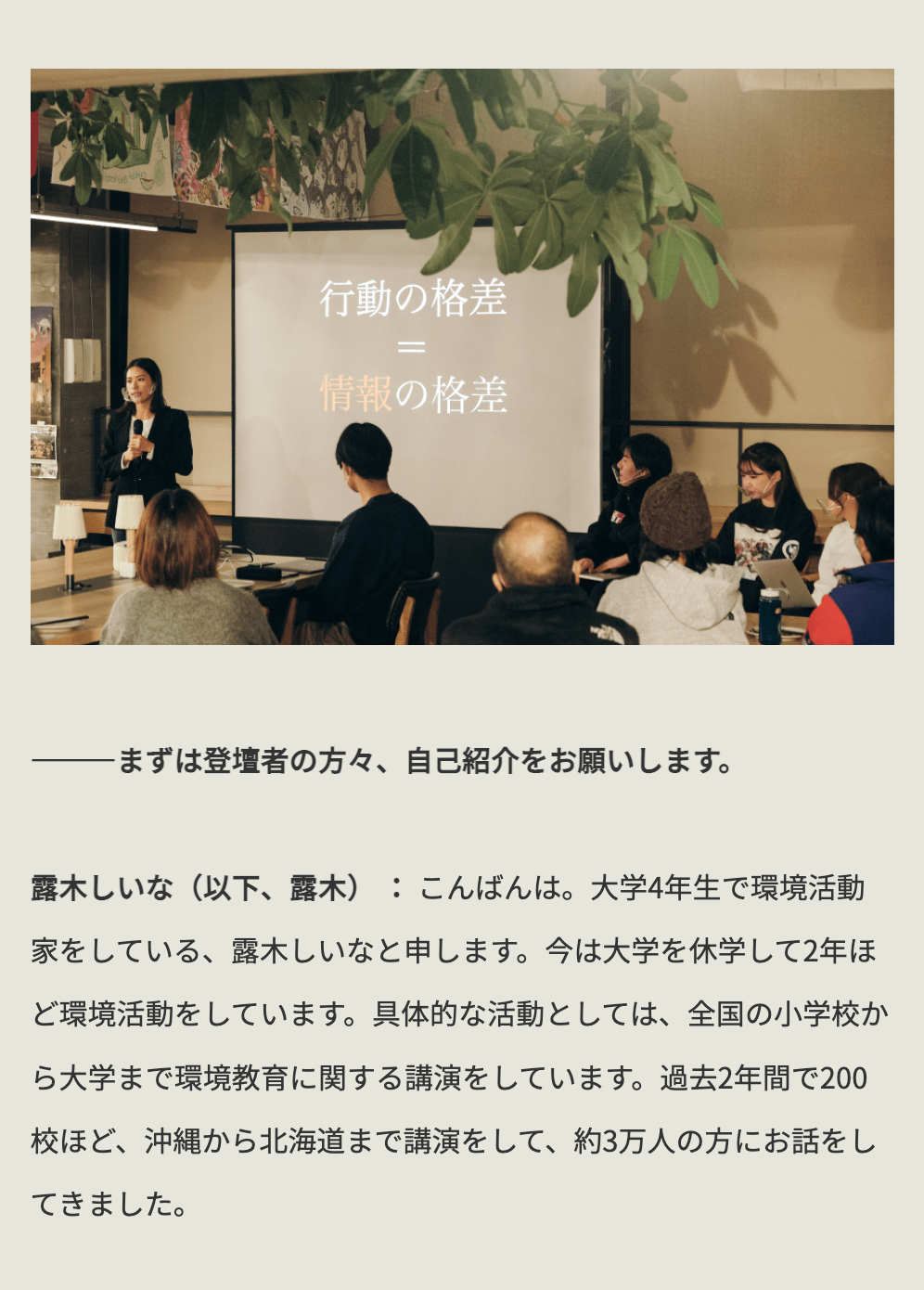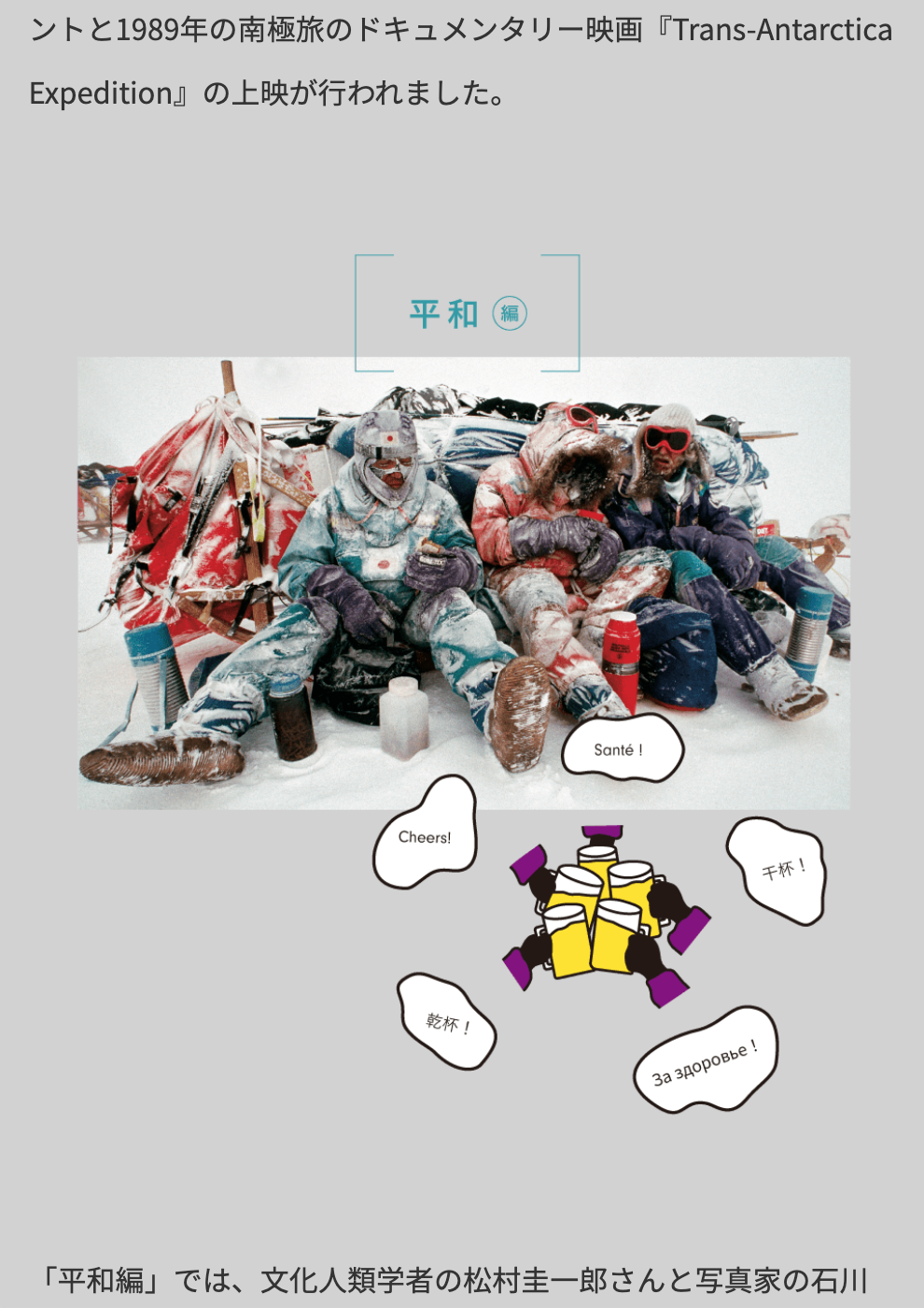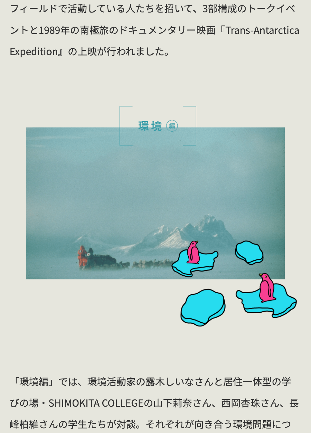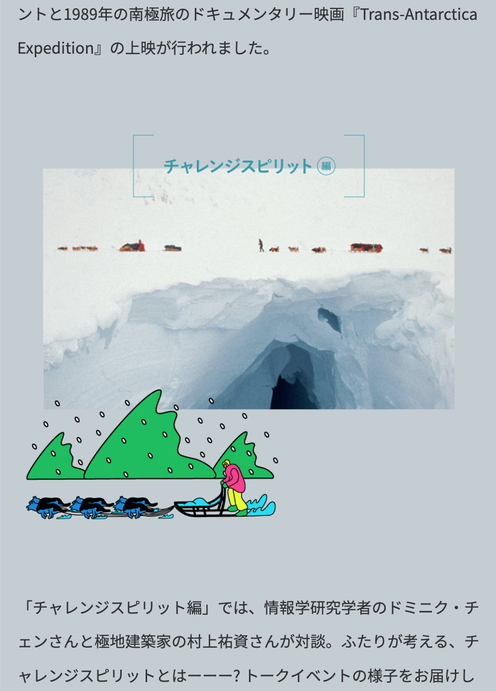 アウトドアブランド〈THE NORTH FACE〉が主催する「THINK SOUTH FOR THE NEXT 2022」のイベントの企画、レポートを担当。かつての犬ぞり南極横断旅に結びつけて、現代のあらゆる分野の挑戦者たちを招いて、「チャレンジスピリット」「環境」「平和」というテーマで3つのイベントを行った。