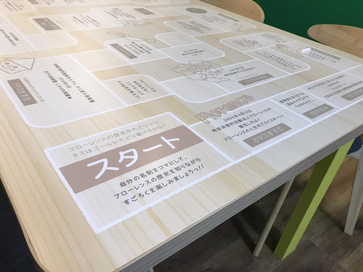 これは、新フロアに登場した【すごろくテーブル】! 2004年の創立から約20年、山あり谷ありの道のりを、すごろくゲーム仕立てで辿れるオリジナルの天板です。