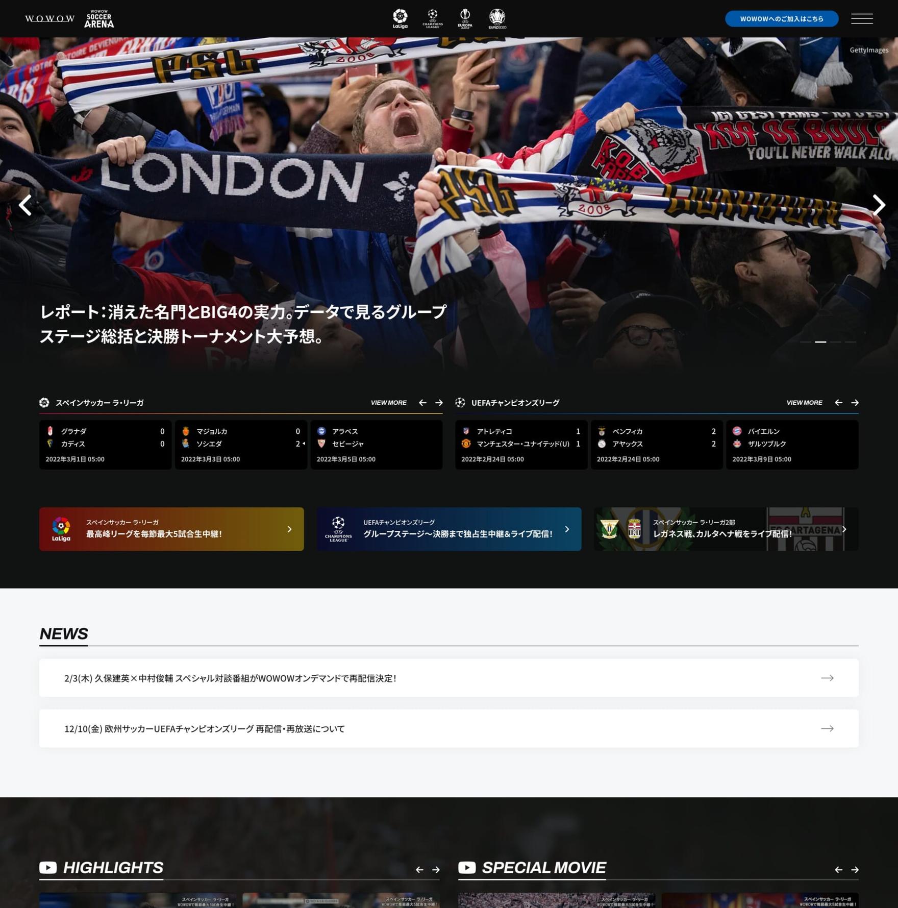 2021年5月にローンチした、WOWOWサッカーとして、初となるコミュニティサイト「WOWOWサッカーアリーナ」の制作を担当。同年6月にはEURO 2020大会の特設サイトの制作・運用も行いました。WOWOWが持つ豊富なコンテンツがひと目でわかりやすく、目的のものにアクセスしやすいサイト設計に。記事コンテンツなど、メディア運用の知見を活かしたコンテンツ制作も一部担当しています。