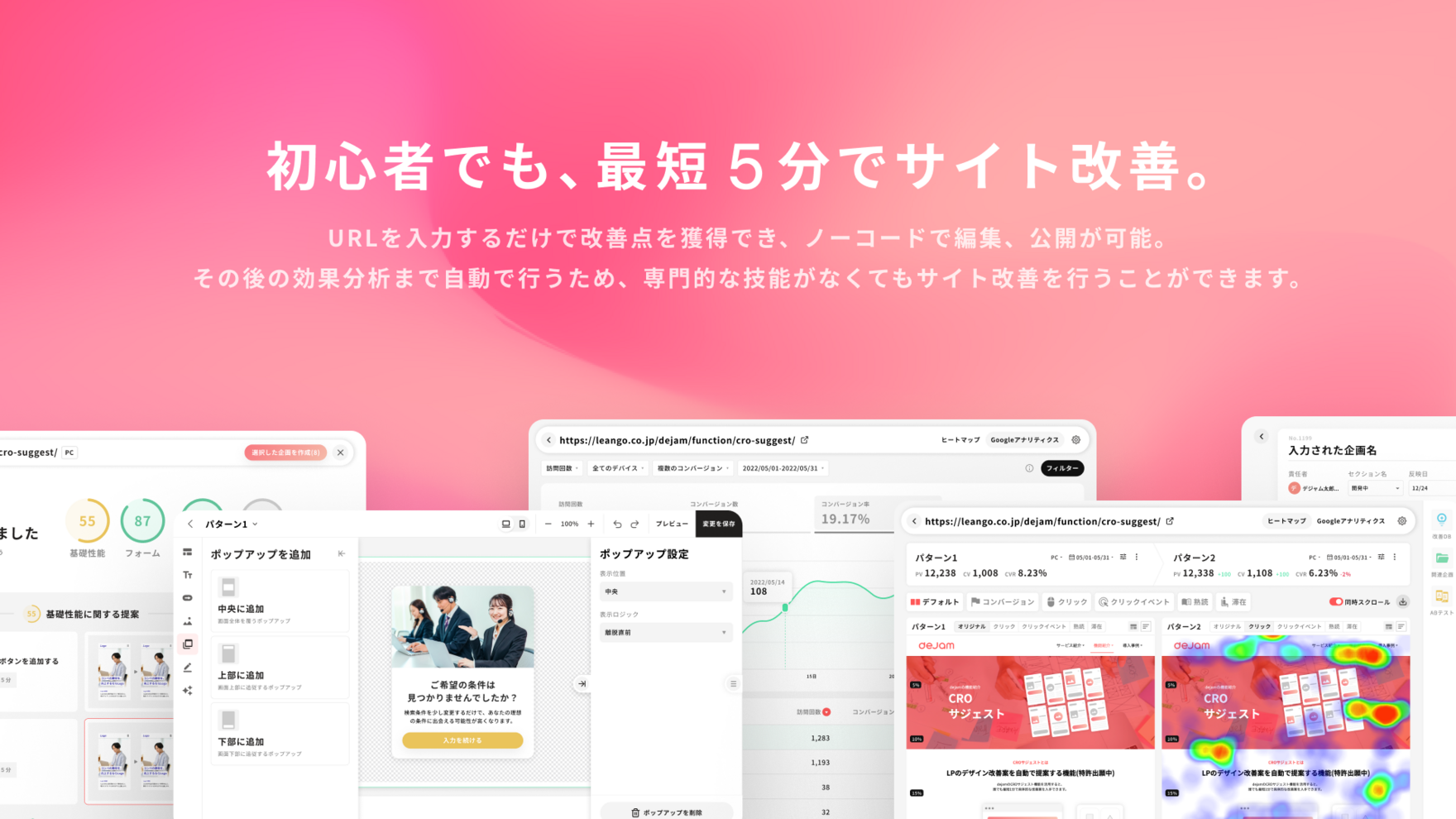 Webマーケティングの一連の業務である、分析からサイト改善案の公開まで、初心者でも最短5分で実施することができます。
