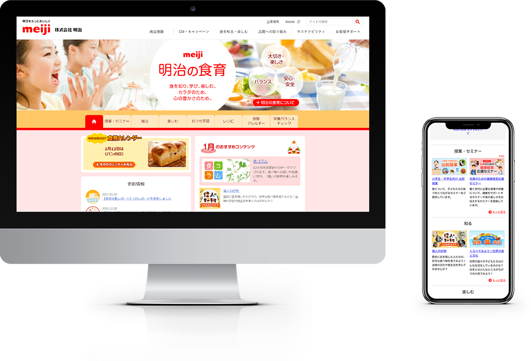 株式会社明治様の食育コンテンツのディレクション、デザイン制作、コーディング、運用を担当しています。