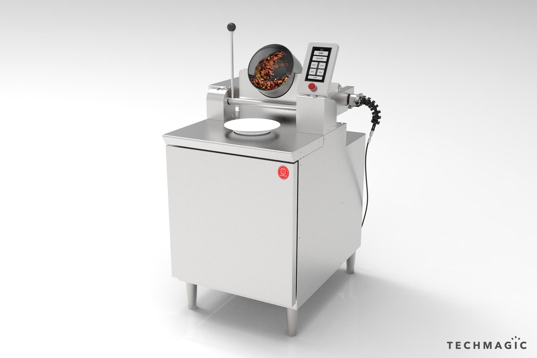 TechMagicが開発した調理ロボットI-Roboは、炒飯・野菜炒めなど、熟練の職人のレシピを自動で再現します。また、I-Roboは、液体調味料の自動供給機能をオプションで追加可能で、調味、攪拌、加熱、調理後のフライパンの洗浄といった一連の動作を自動化することができるロボットです。自動調理においては、メニューに応じて、加熱温度、加熱時間、鍋の回転スピード、回転方向を柔軟且つ適切に調整できます。このように、I-Roboの導入により、人手不足の課題に対し省人化を推進し、解決を目指します。