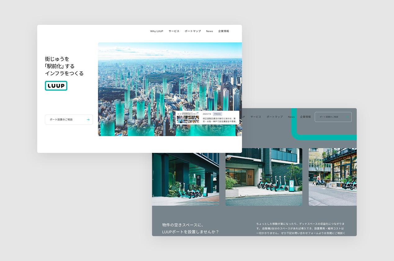 キービジュアルでは、LUUPの導入によって新たなインフラが生まれ街が活性化していく様子を表現しています。Webサイトでは、ロゴのエレメントを用いてLUUPの個性を出しながら、先進性と上質さを感じさせるデザインを目指しました。