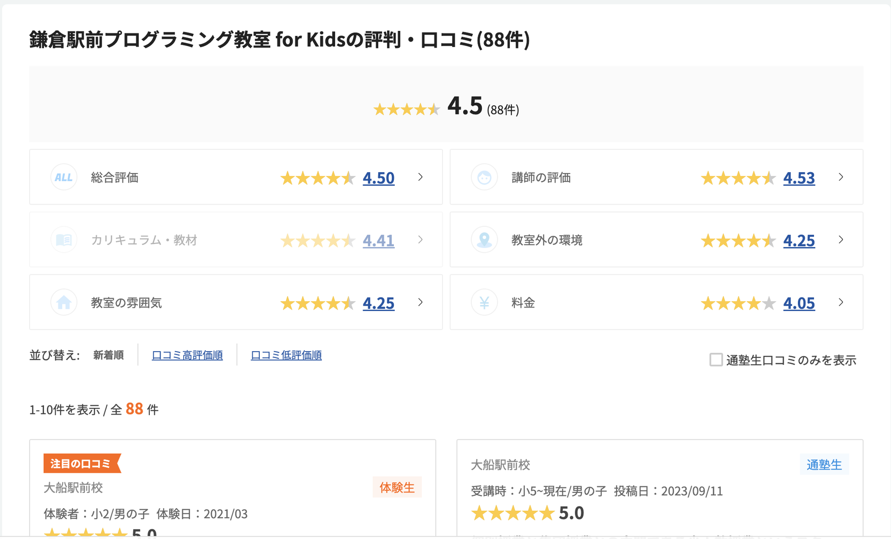 プログラミング教育情報ポータルサイト「コエテコ」に投稿されている、保護者様からのレビューです。2023年10月20日(金)時点でレビュー数88、評価4.5を頂いています。