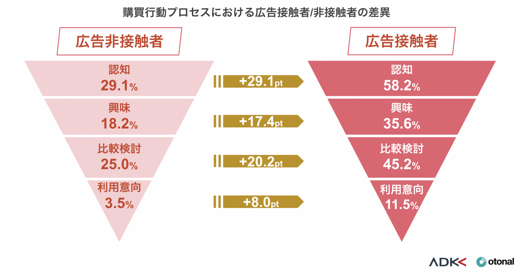 ・比較・検討:広告接触者の方が20.2ポイント高い