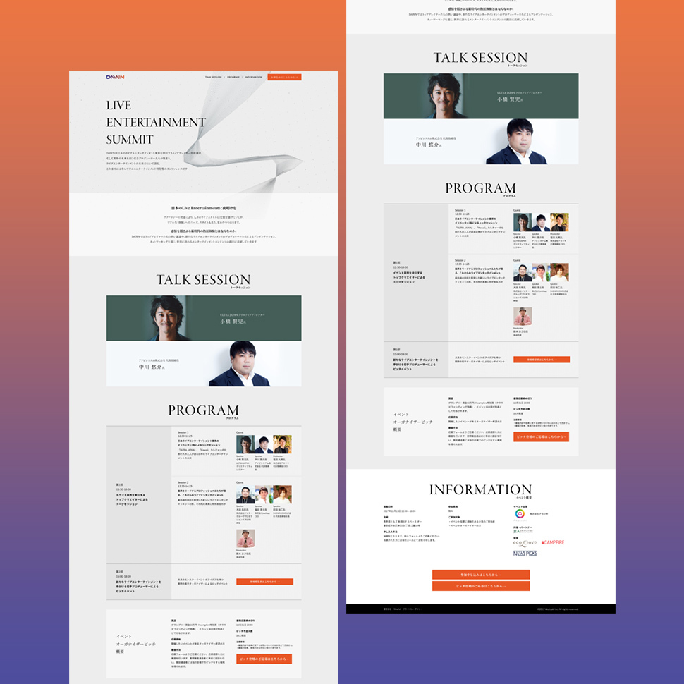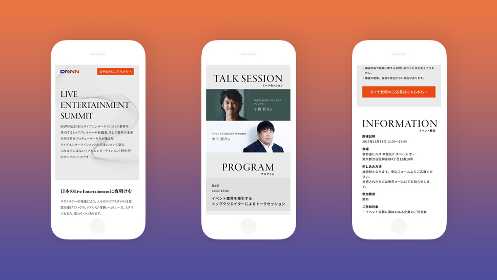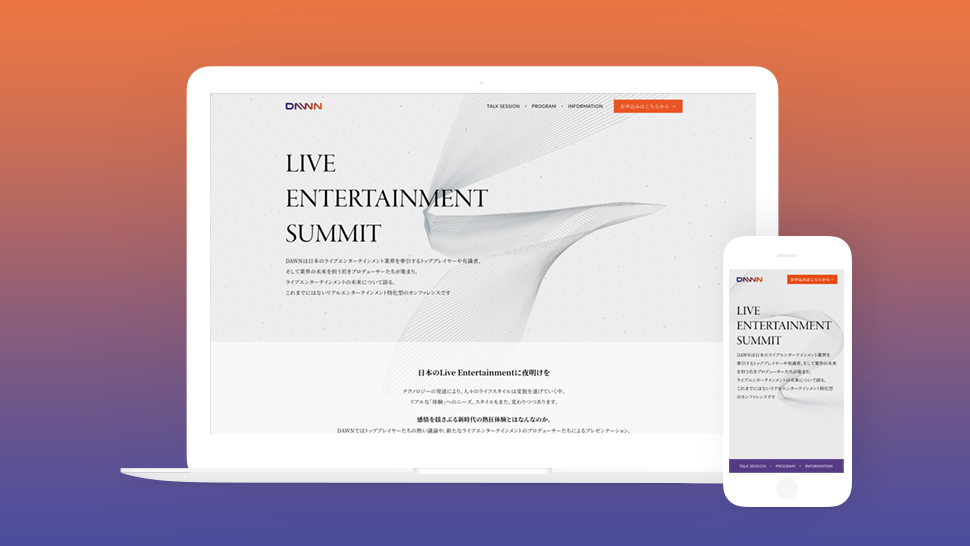 ライブエンターテイメントをテーマにしたサミット、DAWNのロゴデザイン・WEBサイトデザイン・PRを担当。DAWNの名の通り、夜明けを感じさせるキーカラーを使いつつ、感情の波形をモチーフに上下に振幅するロゴタイプを作成しました。