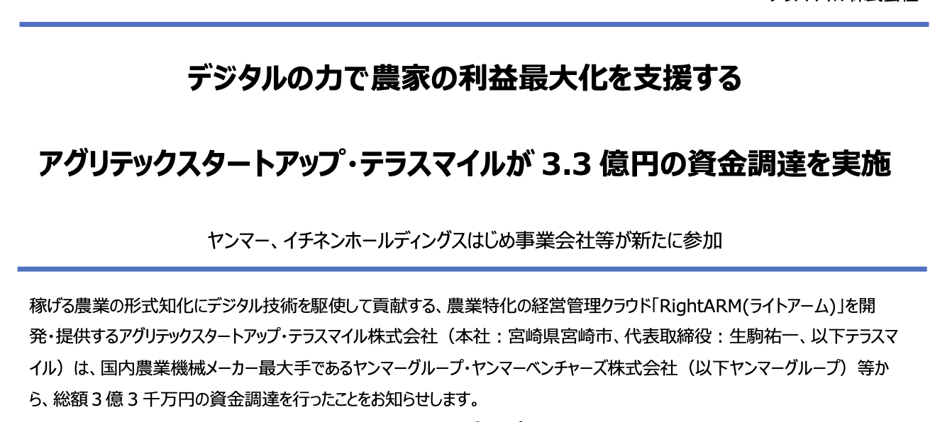 2023.09.13_アグリテックスタートアップ・テラスマイルが3.3億円の資金調達を実施しました