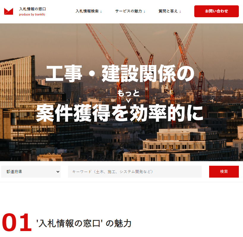 「入札情報の窓口」は国・省庁・市町村といった公官庁が物品の購入や工事を行う際に必要となる、入札案件をまとめたメディアとなっています。(https://trankllc.com/bid/home)