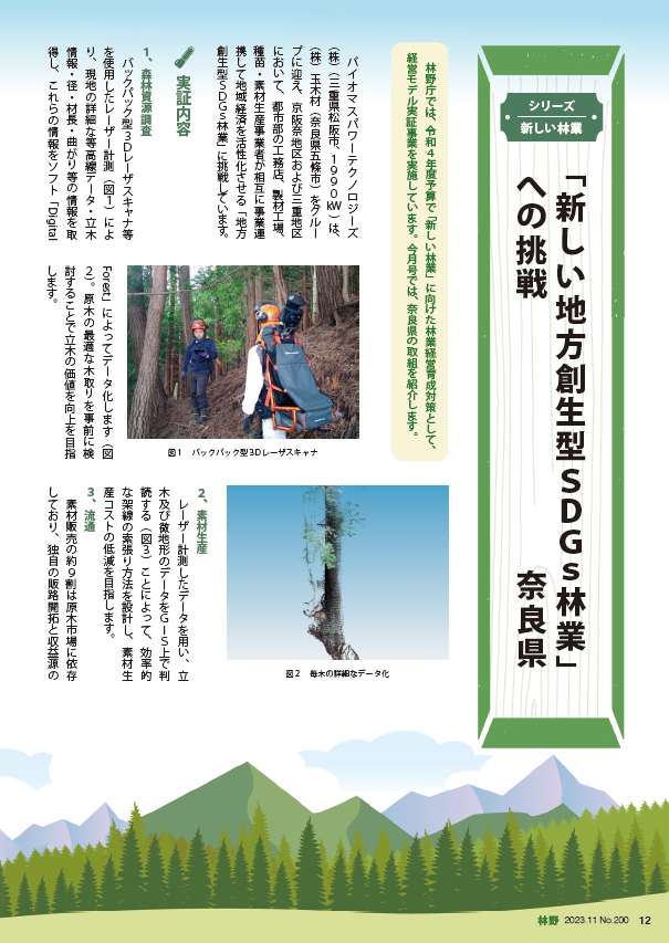 林野庁情報誌「林野」11月号に、林野庁公募「新しい林業」経営モデル実証事業に採択されました当社提案の「京阪奈+三重 需要地と供給地の事業連携による新しい地方創生型SDGs林業への挑戦」が紹介されました。