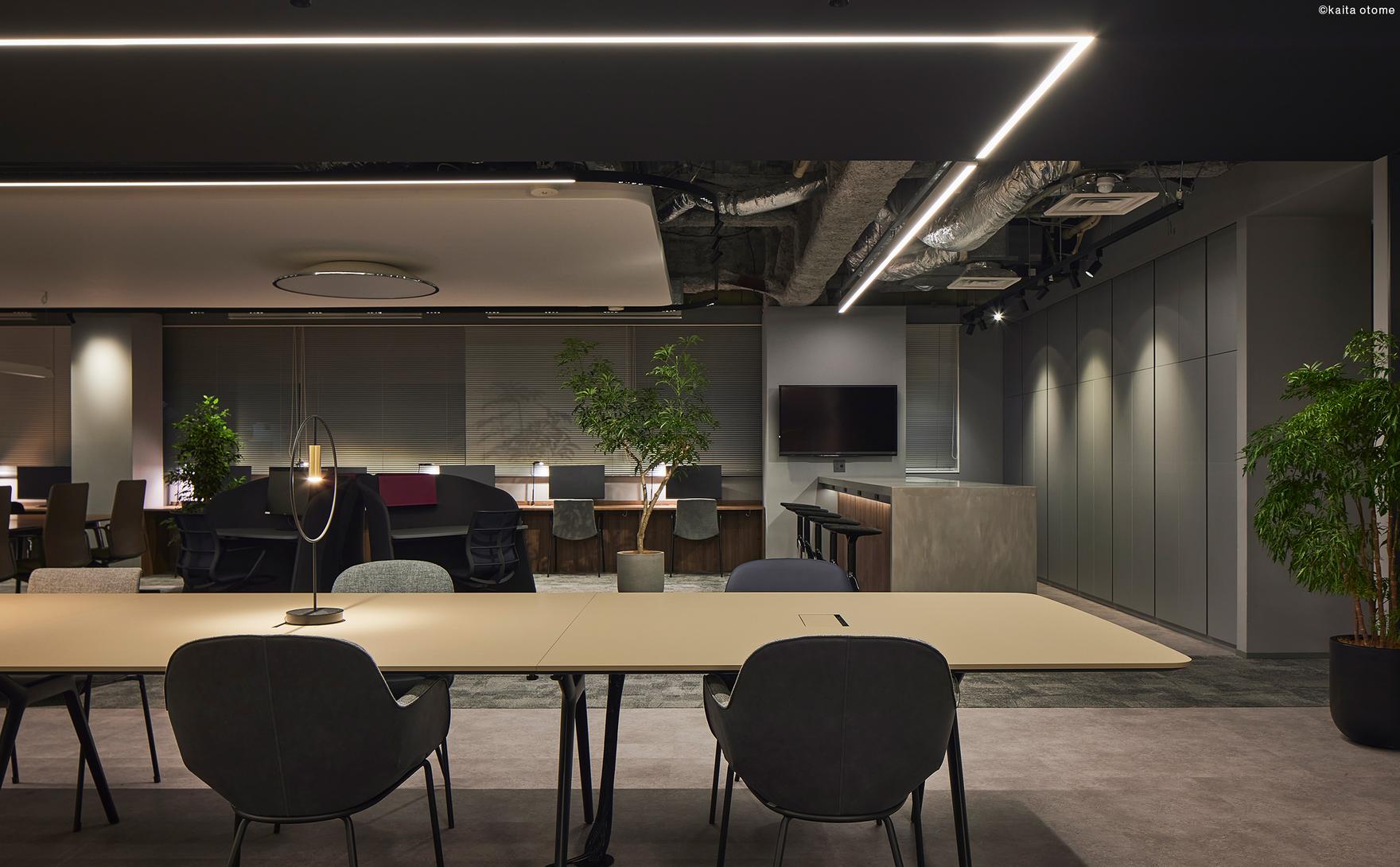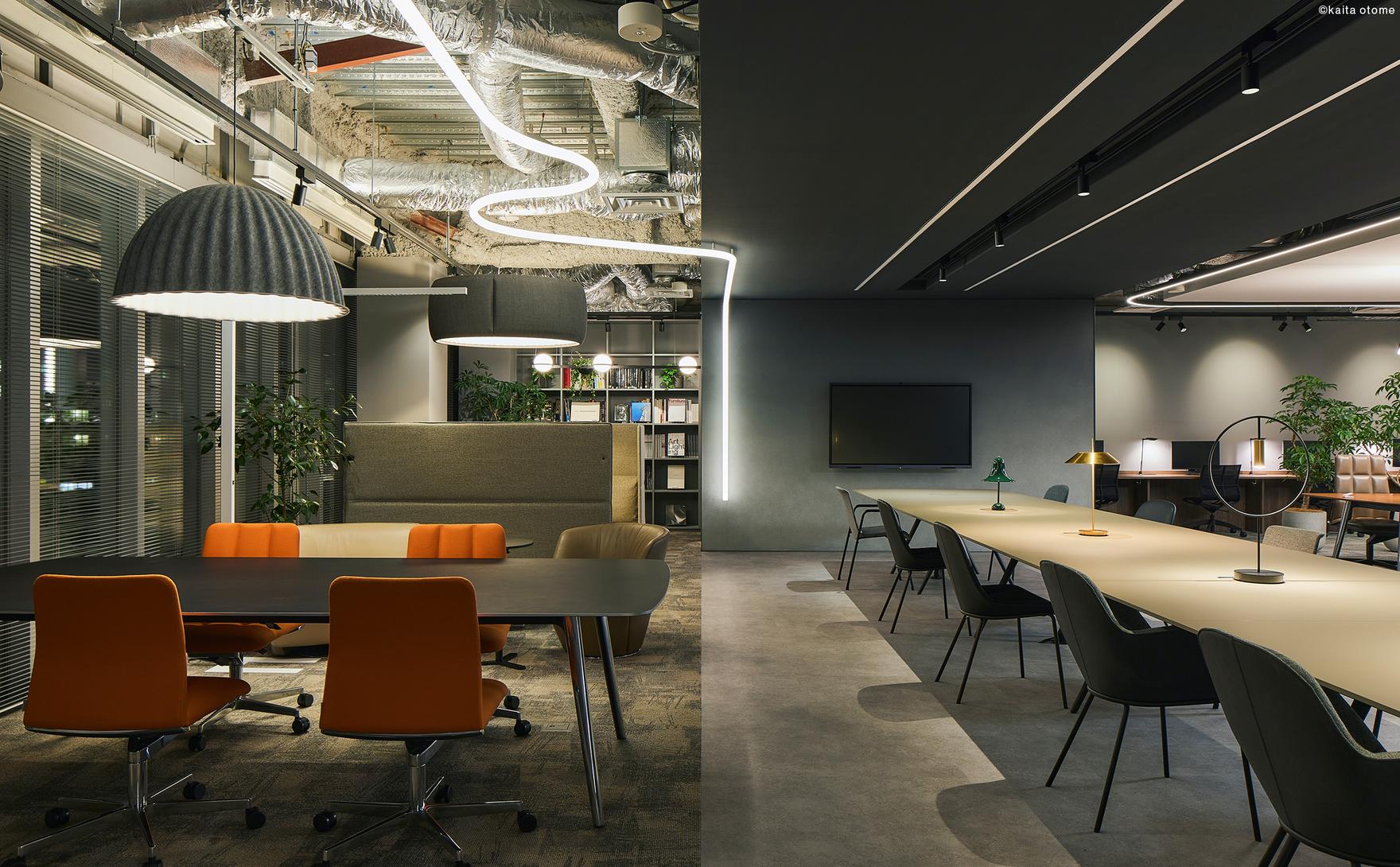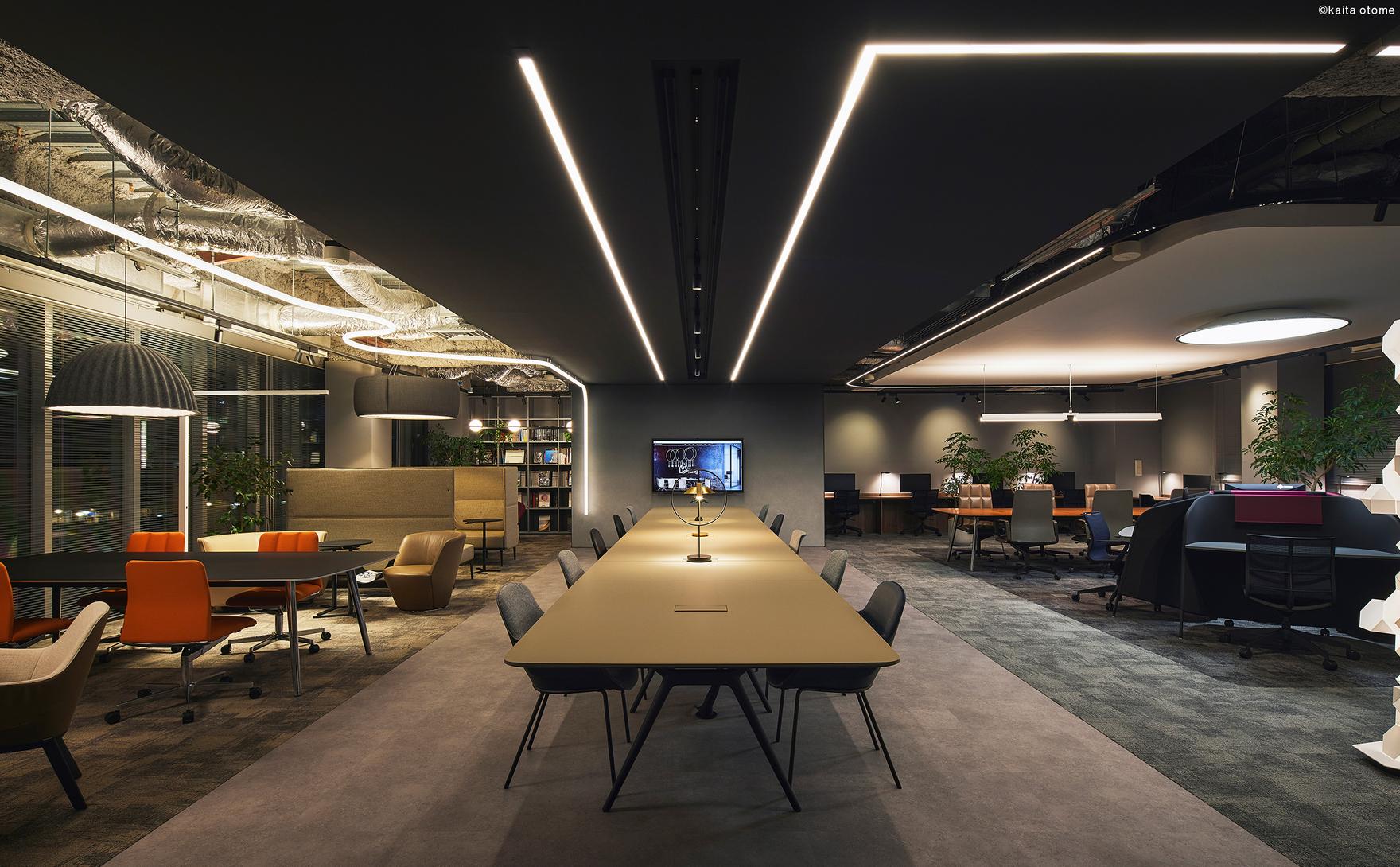 4階はライブオフィスとして計画。多様な照明を配置し、家具と内装だけでは作れない、光のトーンが組み合わさった表情が豊かな環境とすることで、社員が場のイメージを受取り利用できる「照明でつくる働く場の多様性」を体現できる空間とした。
