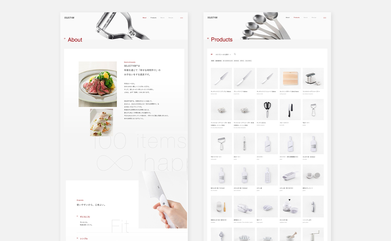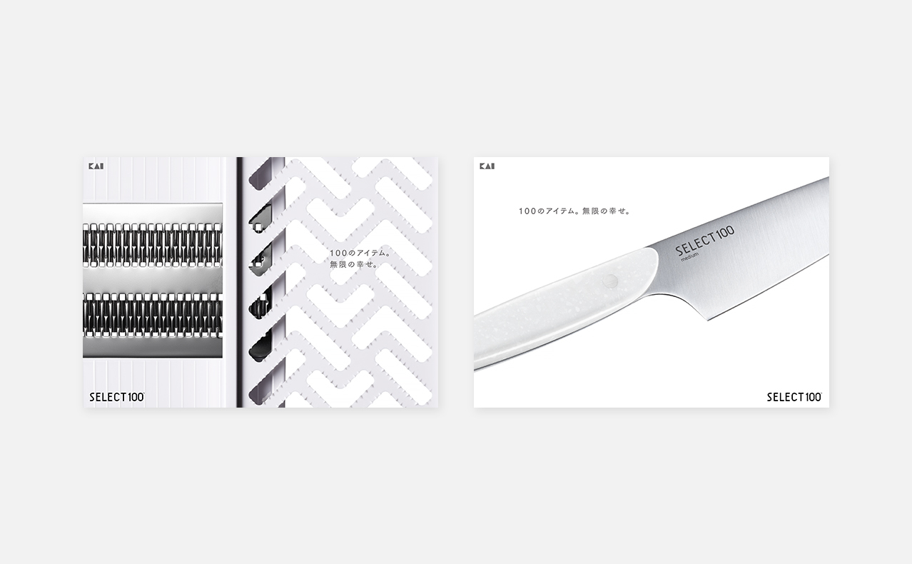 ブランドコミュニケーションのもととなる、キービジュアル、キーコピーを新たに開発しました。「使いやすい道具はシンプルで美しく、手になじむ。」をコンセプトに、道具として特に機能する部分に焦点を当て、キーカラーや質感を強調したキービジュアルを制作。また、カタログやPOP制作のほか、ブランドサイトもリニューアルし、キーコピー「100のアイテム。無限の幸せ。」が描くブランドの世界観を構築しました。