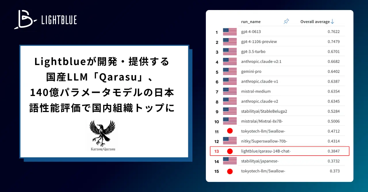 140億パラメータのQwen-14Bに対してファインチューニングしたモデルで、オープンソースのデータセットに加えLightblueが独自に整備したデータセットでトレーニングを行っています。
