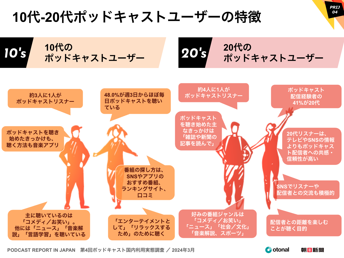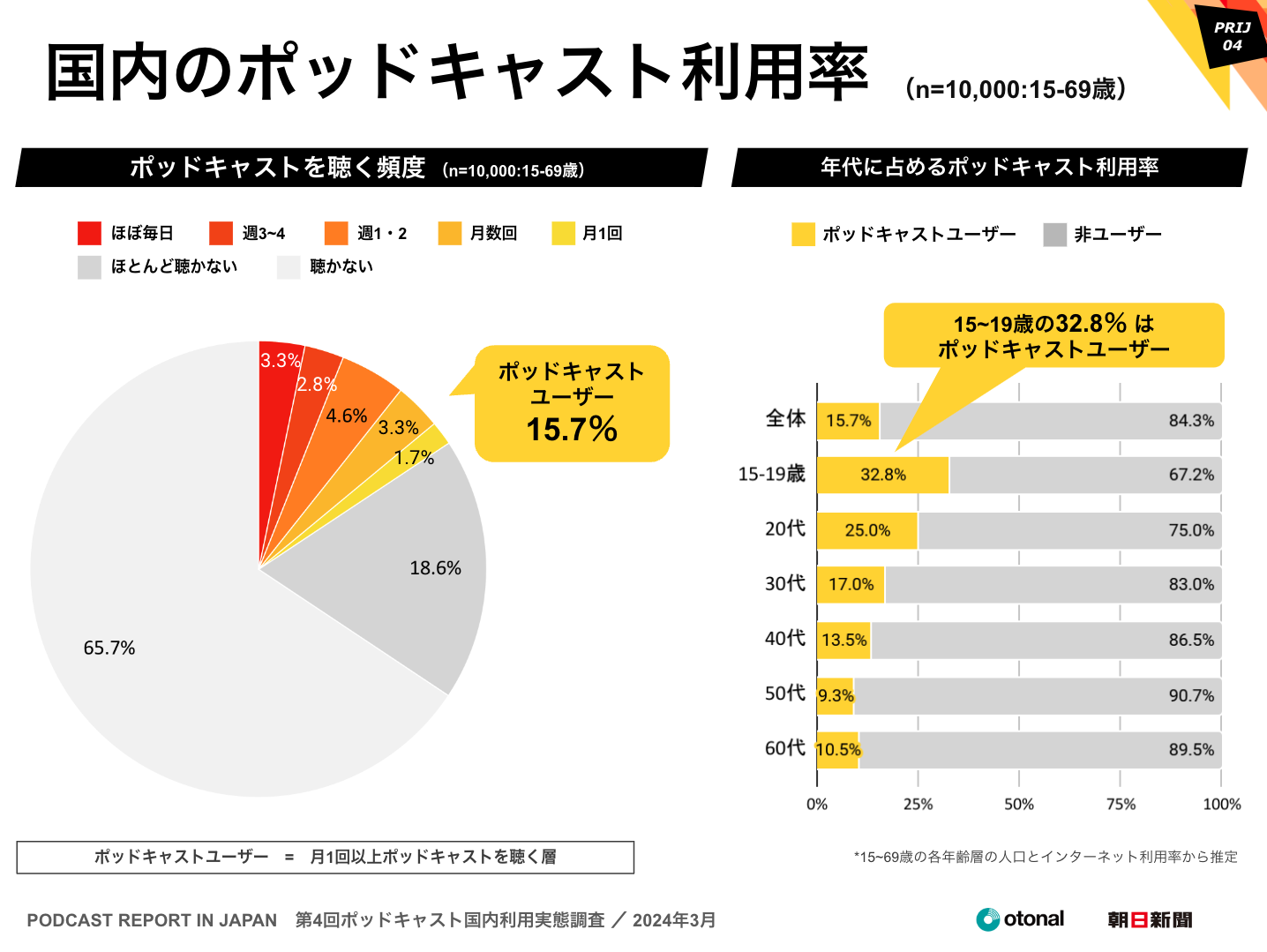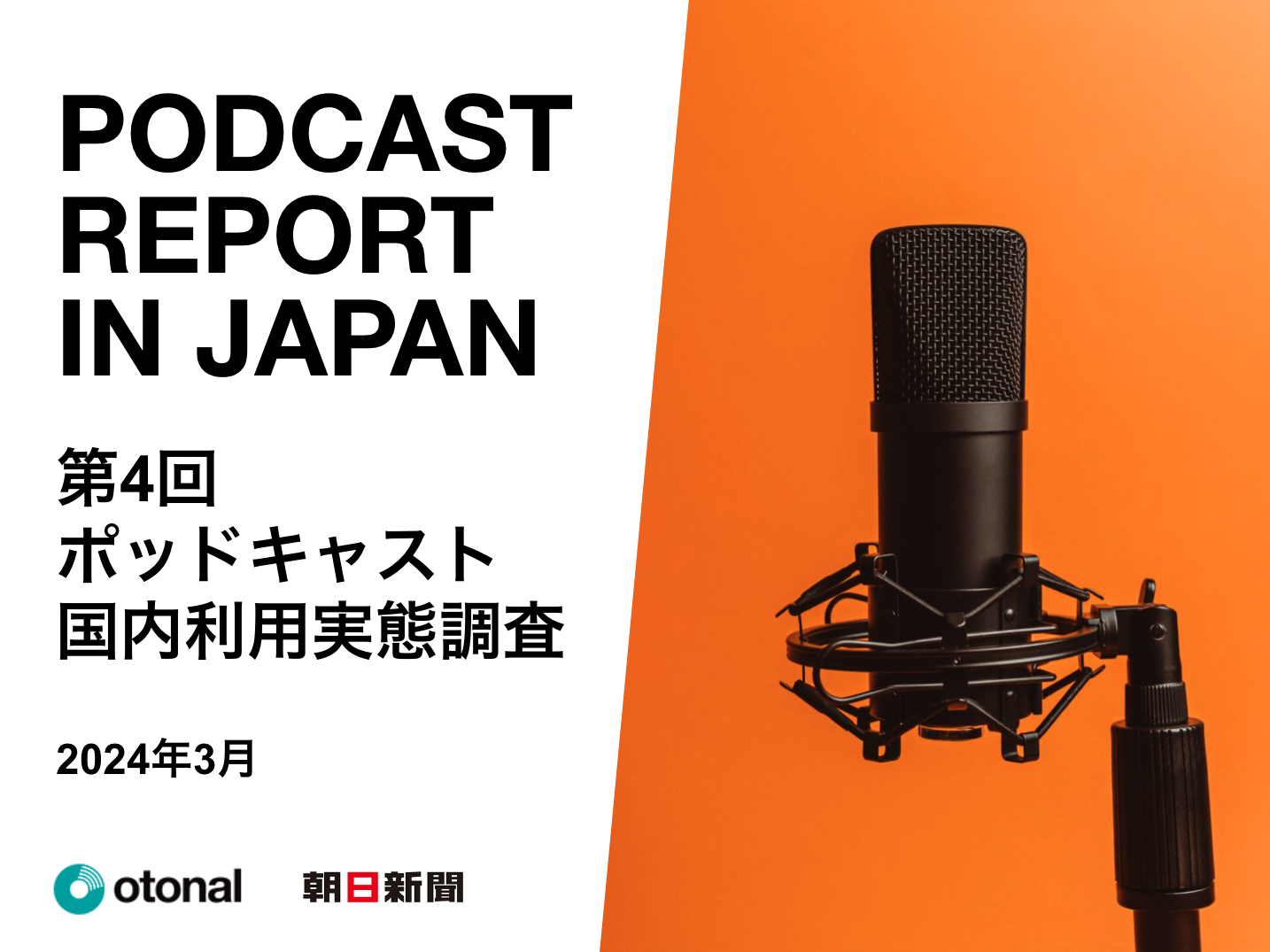 株式会社オトナル(本社:東京都中央区/代表取締役 八木太亮、以下、オトナル)および株式会社朝日新聞社(以下、朝日新聞社)は、2024年3月7日、昨年12月に共同で実施したポッドキャストの利用実態調査の概要を「PODCAST REPORT IN JAPAN 第4回ポッドキャスト国内利用実態調査」として公開しました。