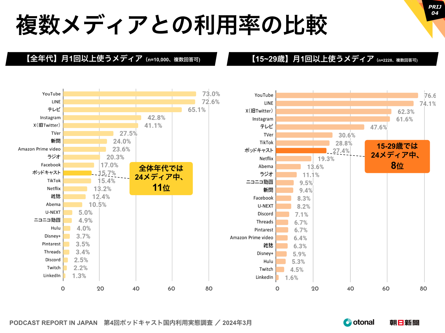 また対象を15〜29歳にしぼると、ポッドキャストの利用率は27.4%(全てのメディアで8位)となり、Amazon Prime Video、ラジオ、Facebook、新聞を上回る結果となっています。