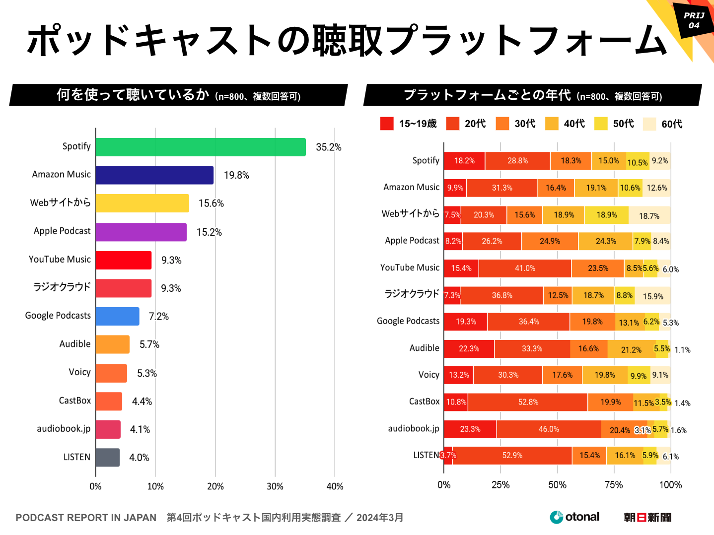 ■ポッドキャストを聴く方法はSpotifyが1位。Amazon Musicが2位に。サービスごとの年代傾向も明らかに