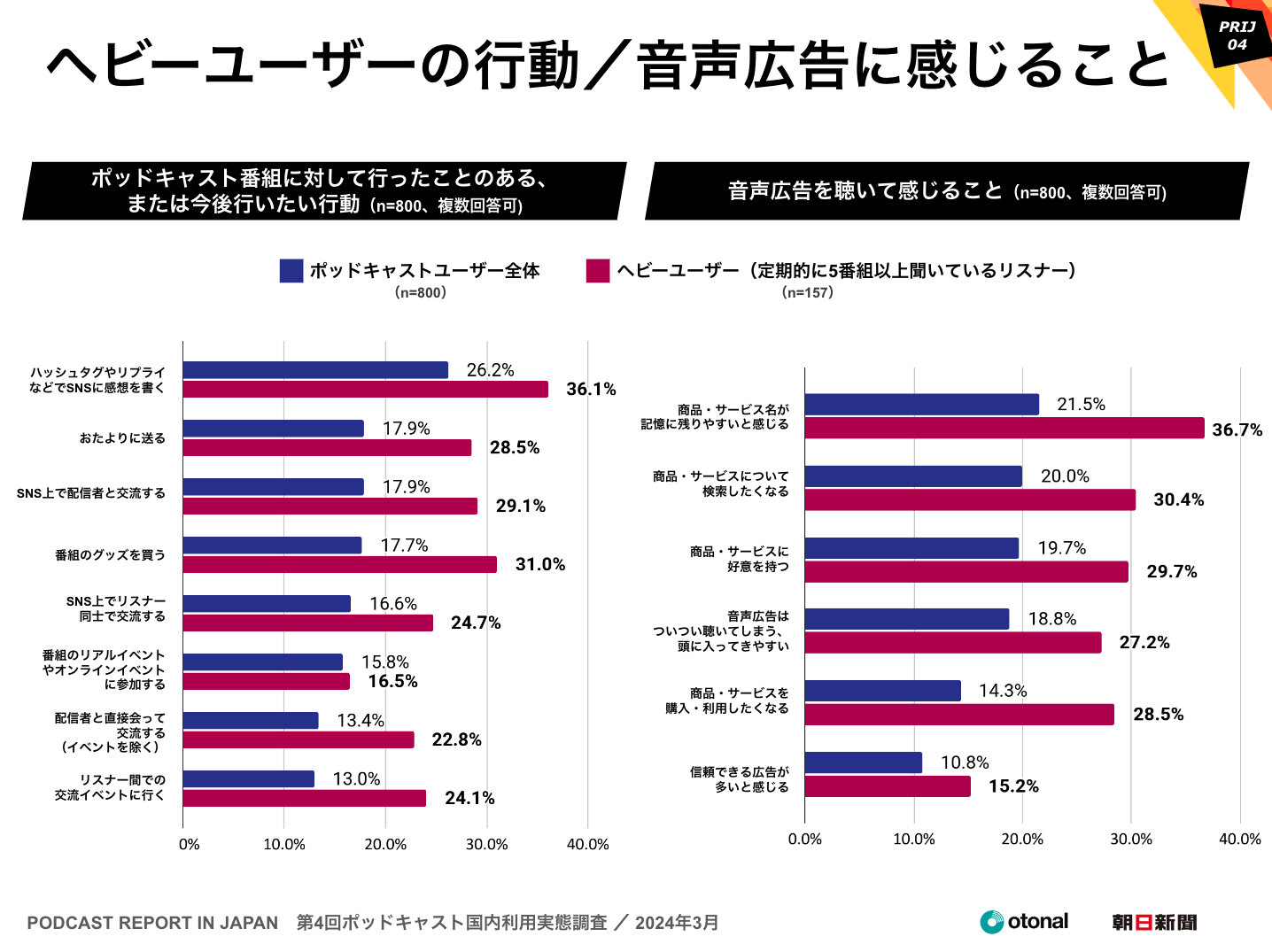 またヘビーユーザーは、ポッドキャスト番組に対して積極的な行動を行う意向が強いことが明らかになりました。