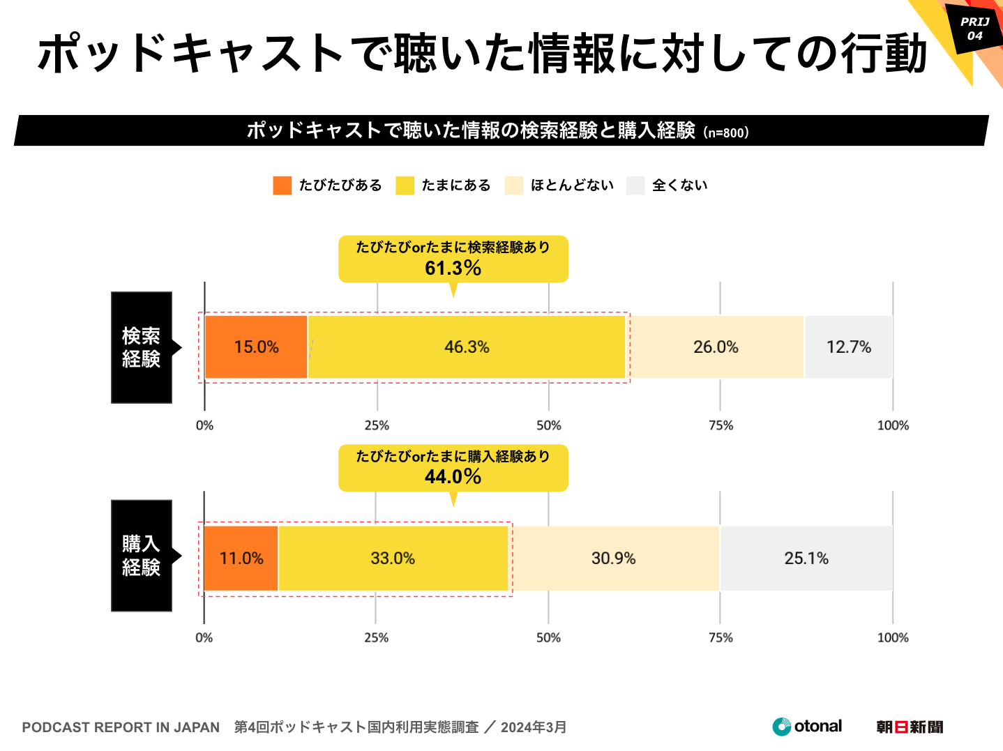 ■ポッドキャストで聴いた情報を、ユーザーの6割が検索、4割が購入経験あり