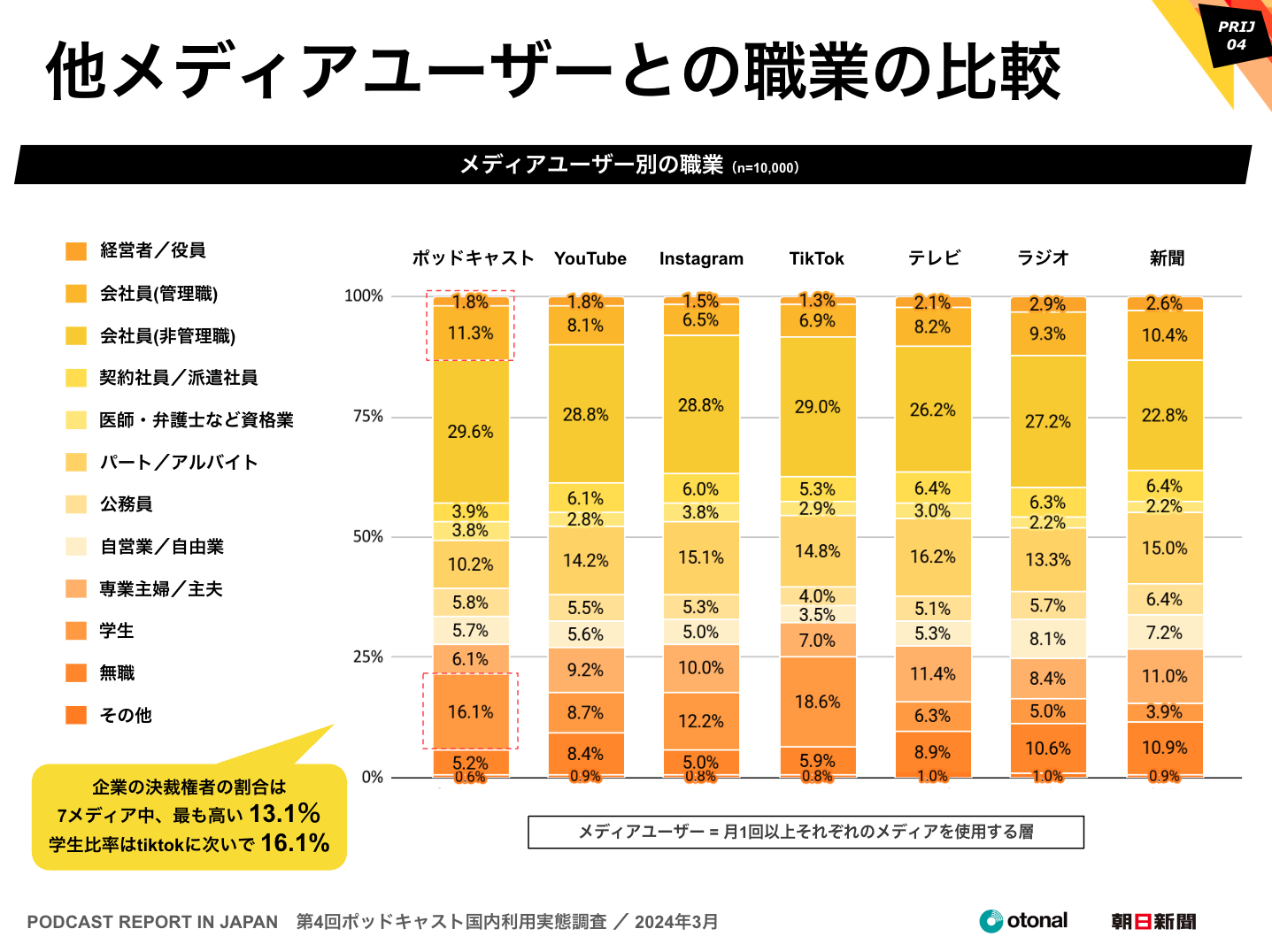 ポッドキャストユーザーの職業に関する他6つのメディアとの比較調査では、企業の決裁権者(経営者、役員、管理職)の比率が13.1%と、最も高い結果となりました。