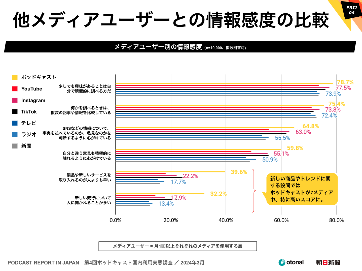 メディアユーザー別に情報感度を比較した調査では、全ての回答項目においてポッドキャストが最も高い結果となりました。ポッドキャストユーザーは、新しいトレンドへの感度が高い傾向がみられます。
