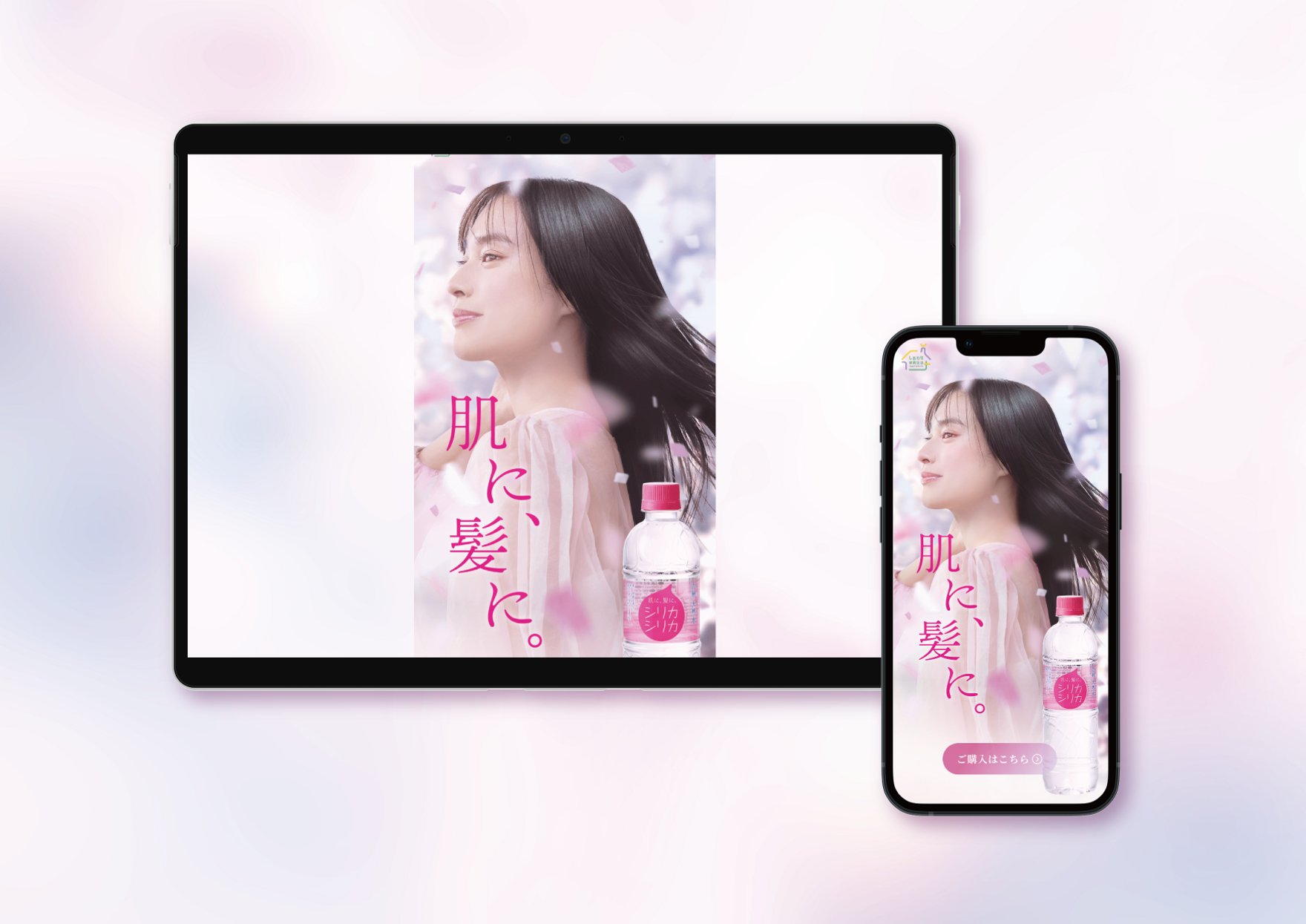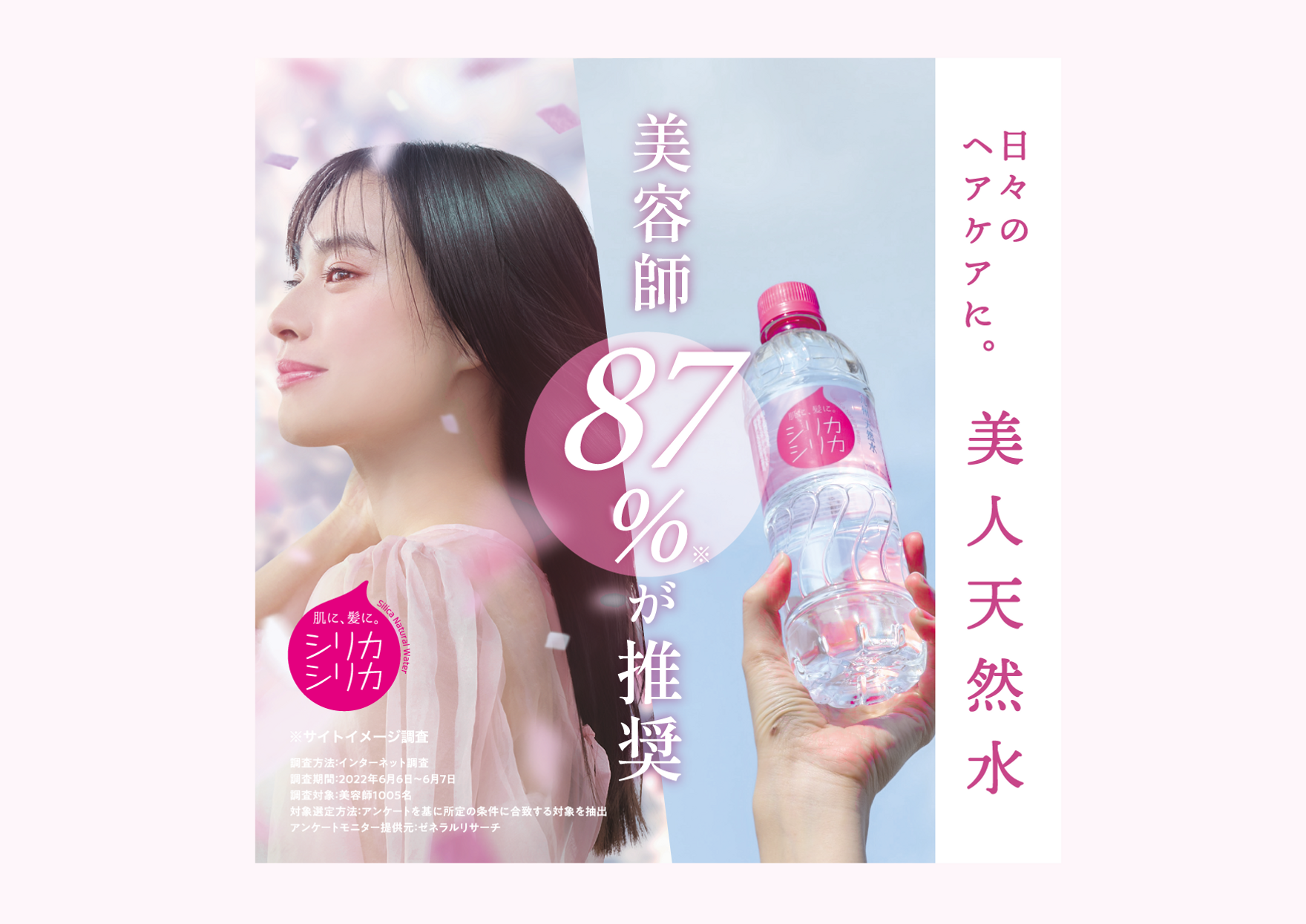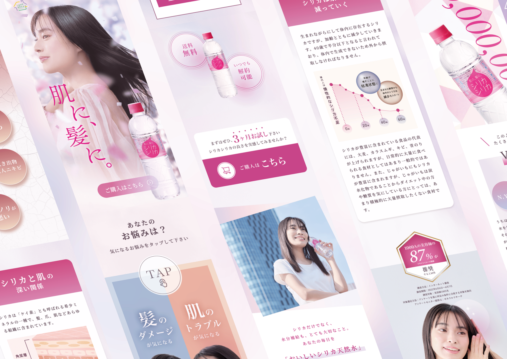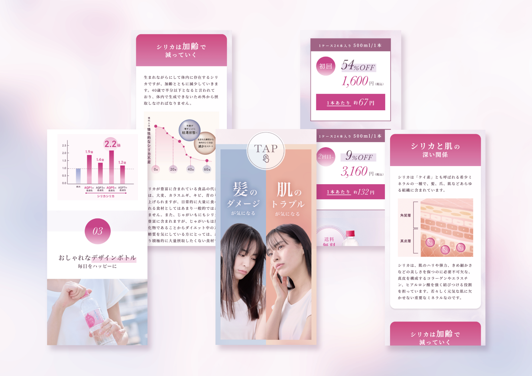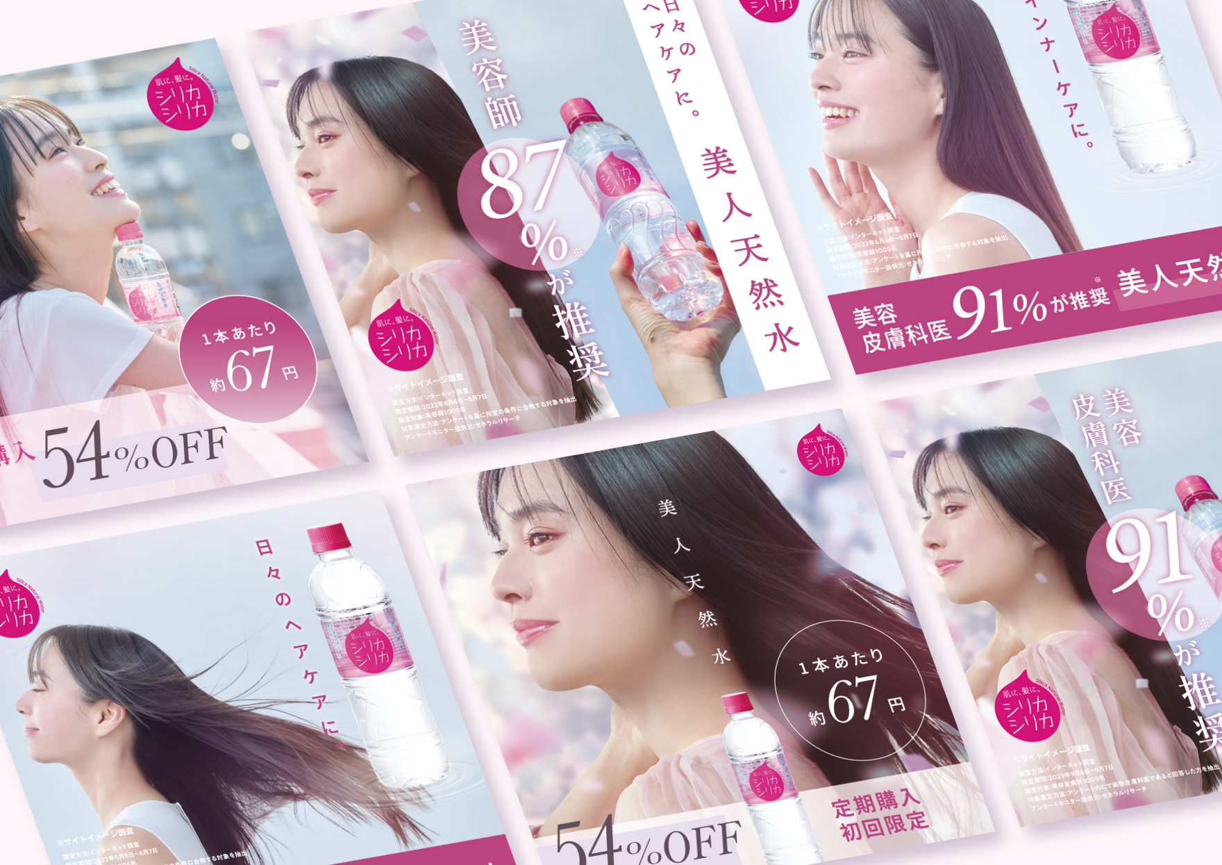 チョイスジャパン株式会社の代表的な商品である天然水「シリカシリカ」の、マーケティング・LP制作・広告動画/静止画制作及び運用を担当しました。商品が元来持つ魅力やブランド力を最適化した表現を突き詰め、出した答えは「まばゆい春の透明感」というキーワード。クリエイティブ全体のトーン&マナーを淡く儚いムードに統一することで、ロゴやパッケージを変えることなく商品に期待できる効果を最大限に高めるとともに、「髪」「肌」の悩みにアプローチする手法で顧客の共感を得、購買意欲を掻き立てる広告へと仕上げました。