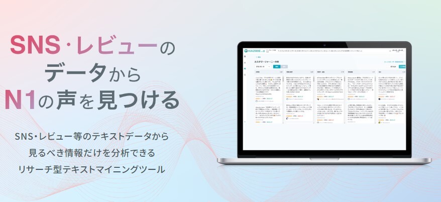 KAIZODEは、SNS・レビュー等のテキストデータから顧客のインサイトを発見し、 商品開発やサービス改善に繋がるリサーチ型テキストマイニングツールです