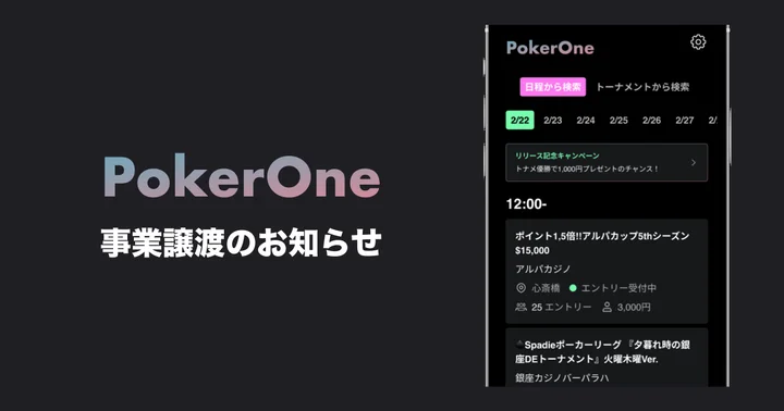 ONE株式会社(本社:東京都港区、代表取締役:畠中理弥、以下:ONE)は、アミューズメントカジノのトーナメント検索アプリ「PokerOne(ポカワン)」を、2022年6月27日をもちまして株式会社デック(本社:京都府京都市、代表取締役:谷口徹、以下:デック)に事業譲渡したことを発表します。