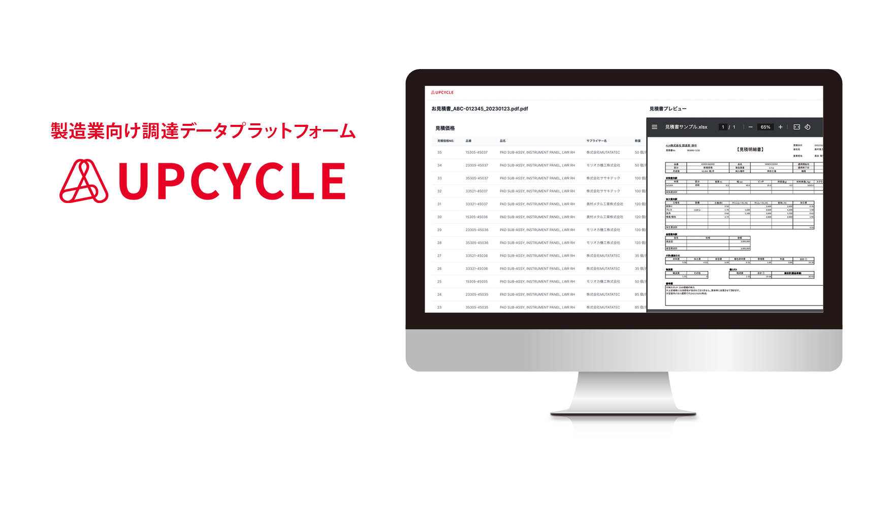 製造業の調達・購買部門向けの調達データプラットフォームである「UPCYCLE」はデータをもとに調達業務の高度化を支援します。これまで有効活用することが難しかった複雑な直接材の見積書の内容が自動でデータベース化され、見積査定業務の効率化や多様な切り口での分析が可能になります。これによってデータをもとにした根拠ある調達購買活動を実現することができます。