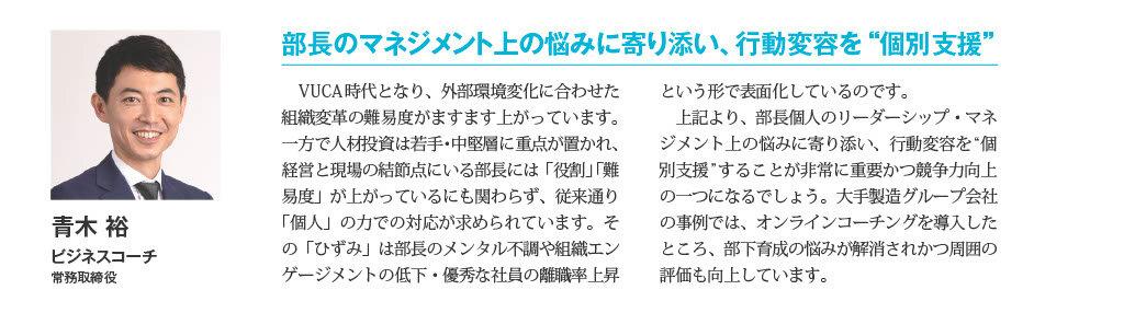 ビジネスコーチ株式会社(以下、ビジネスコーチ社)は、株式会社日本人材ニュース社が定期的に発行する人事部長向け専門誌「日本人材ニュース」 7月号の特集記事に、当社常務取締役の青木が人的資本経営の推進を支援している専門家として寄せたコメントが掲載されたことをお知らせします。