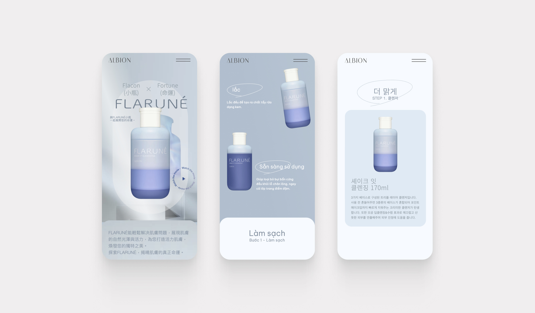 コスメや基礎化粧品を展開するアルビオンは2022年8月に新しいスキンケアラインFLARUNÉを発売。国内での人気が高まる中、2024年にアジア圏5カ国でのリリースが決定し、英語、韓国語、繁体字中国語、ベトナム語の4ヶ国語でブランドサイトを制作しました。